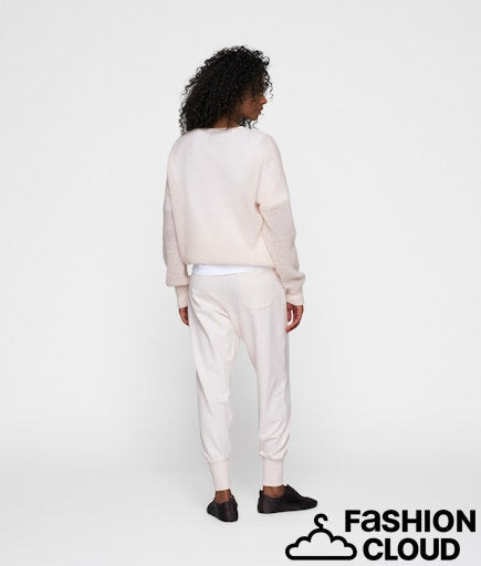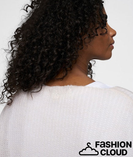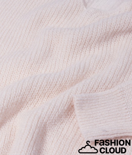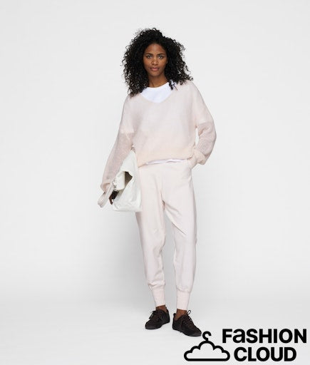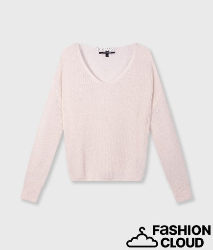 Zachtroze, gebreide knit met V-hals. Siert in zijn eenvoud, waardoor hij zeer elegant kan gestyled worden.