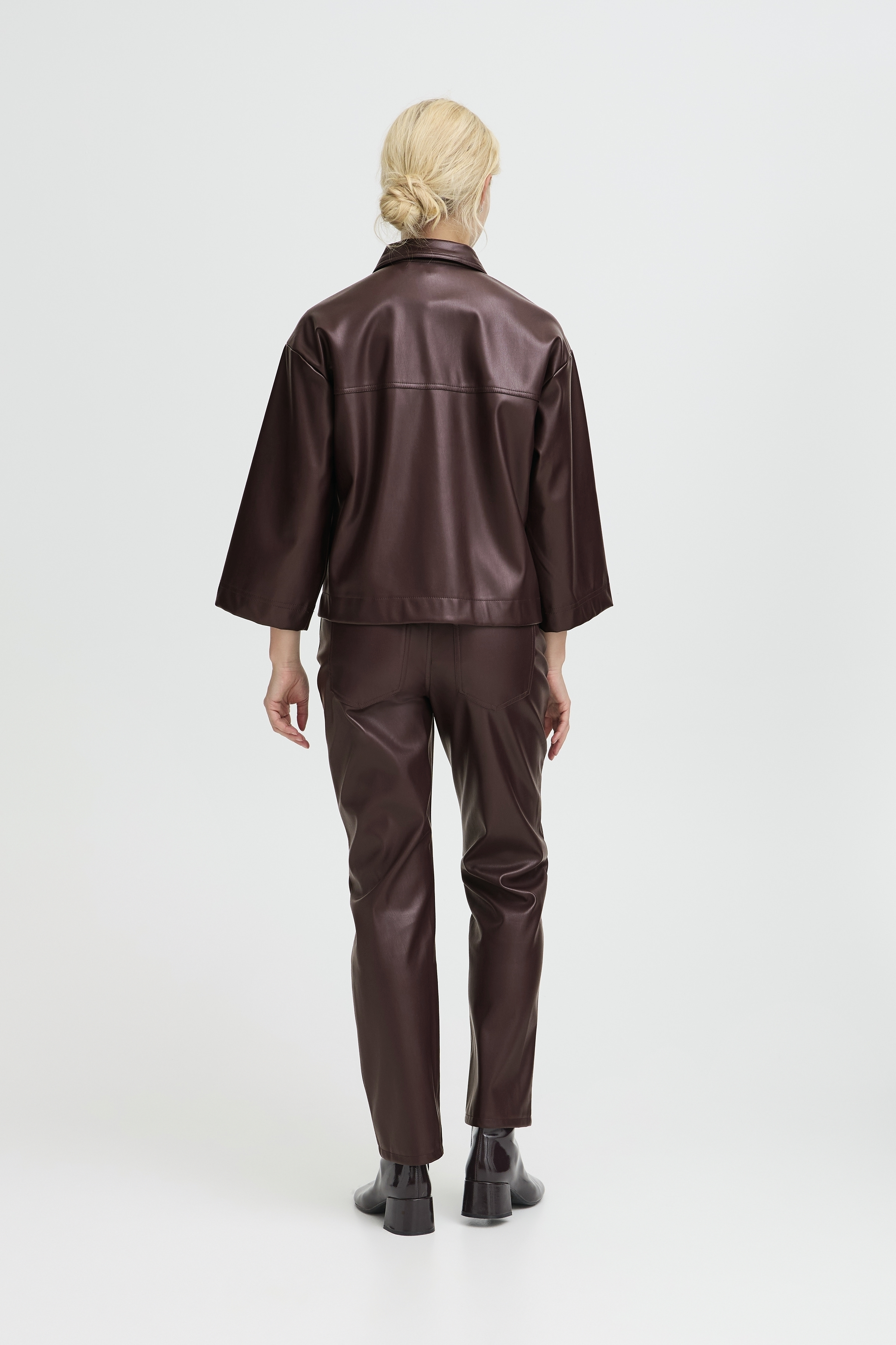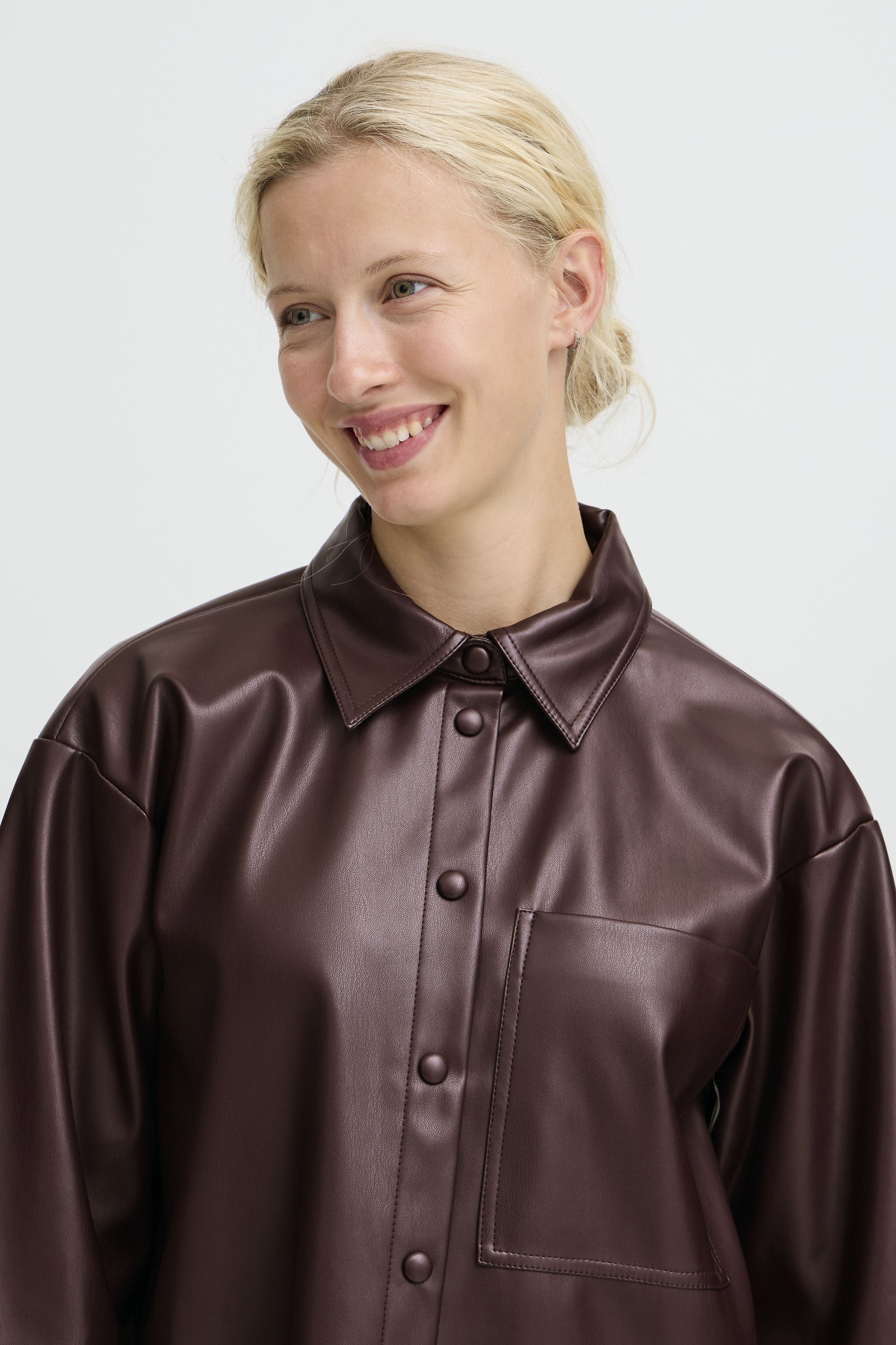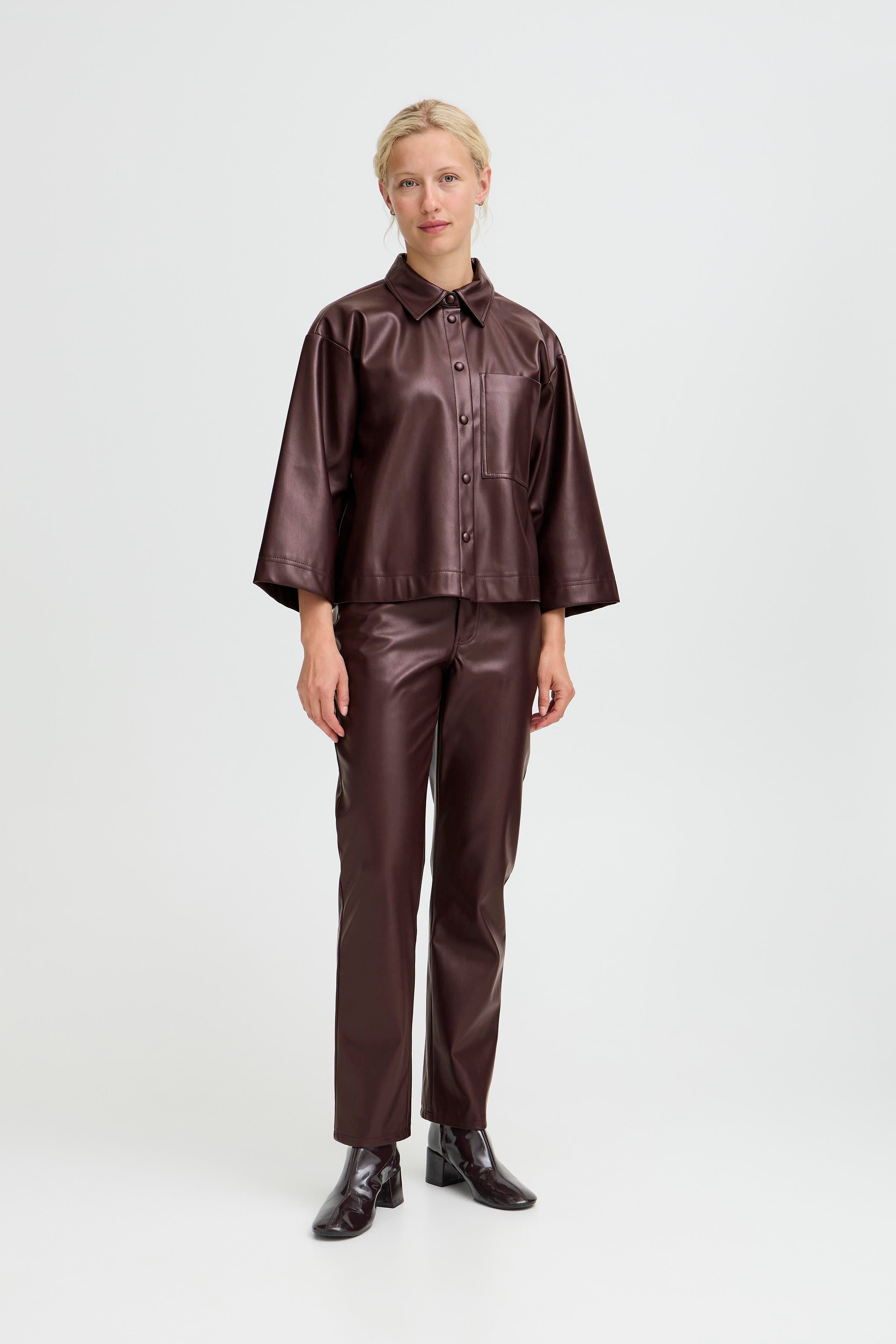 Het Enid overshirt is een kunstlederen overhemd in een mooie burgundy kleur. Het heeft 1 subtiel opgestikte borstzak en een knoopsluiting van boven tot beneden.