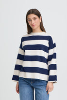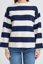 Deze leuke sweater heeft een relaxed fit, wat hem heel comfy en trendy maakt. Door de wijde strepen in navy en wit oogt hij heel zomers en dus ideaal om over je zomeroutfit aan te trekken wanneer het frisser wordt. Combineer met een coole witte broek en slippers voor een frisse 'marinière' stijl.