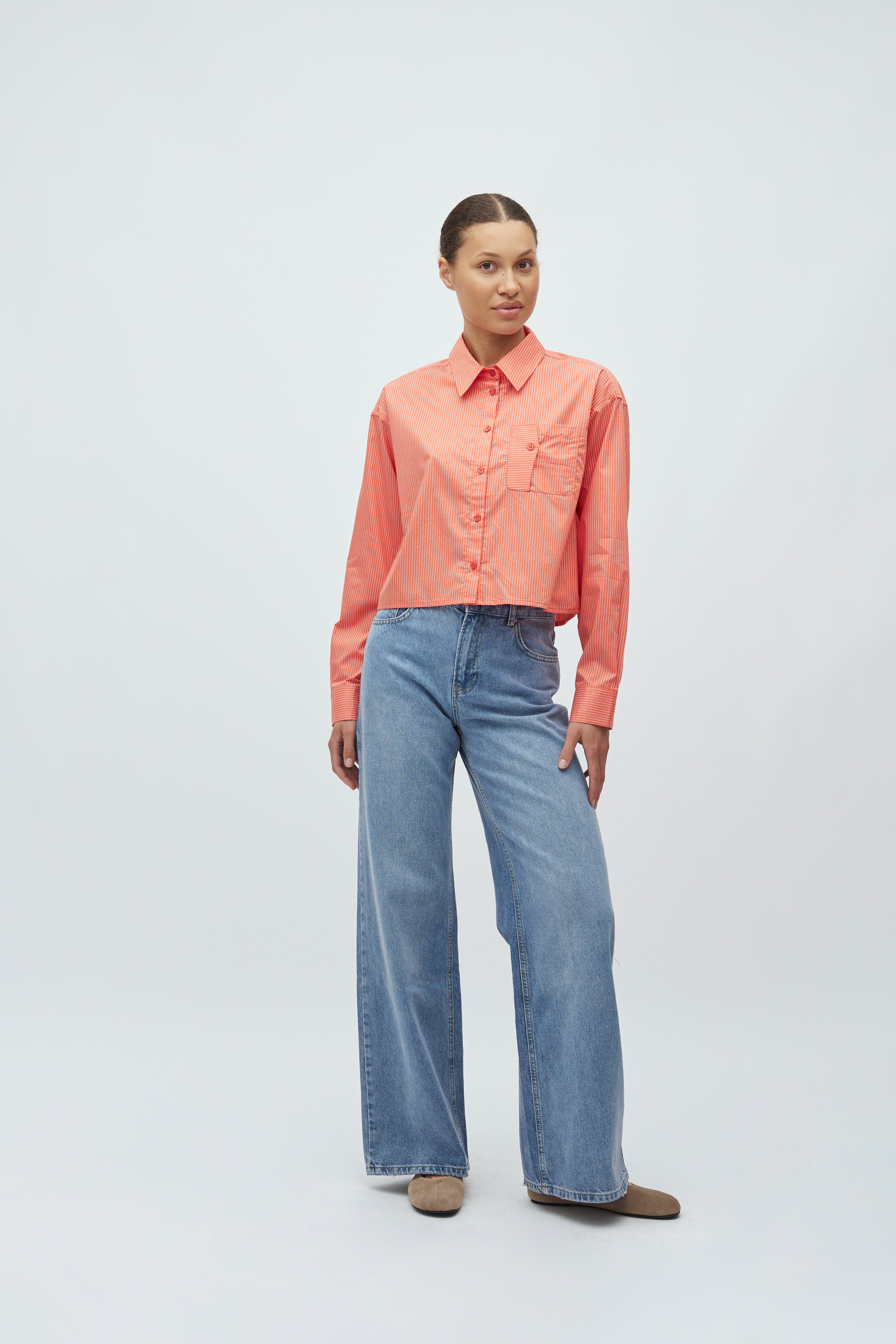 Het Emmelia blousje is een echte blikvanger dankzij zijn frisse, koraalachtige tint en subtiele streepjesprint. De cropped snit geeft het blouseje een moderne, jeugdige look, terwijl de klassieke kraag en borstzak zorgen voor een tijdloze touch.