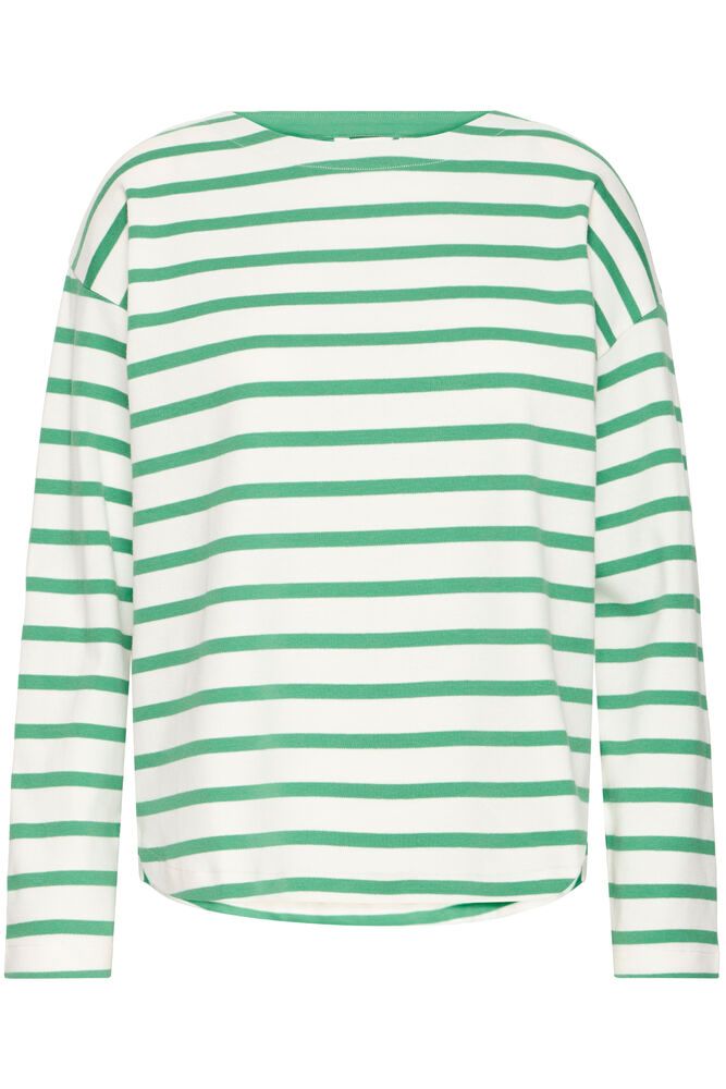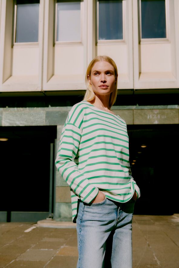 De Ramsi sweater is er dit jaar in een groen streepjespatroon. Dezelfde zachtheid en dezelfde comfortabele fit. Elk jaar een gewild item.