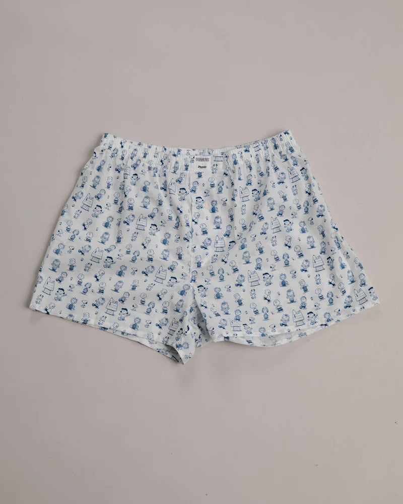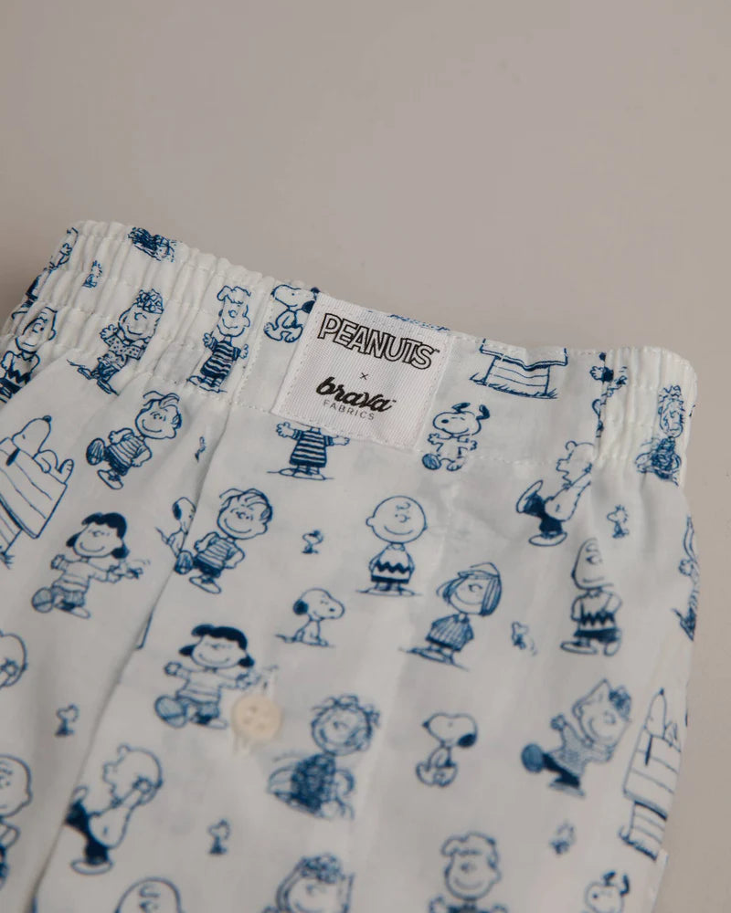 Elastische boxers met Peanuts-print in blauw en wit, uit de Peanuts-collectie van Brava, hebben een knoopsluiting en zijn zo comfortabel als ze lijken. Ethisch gemaakt van biologisch katoen.