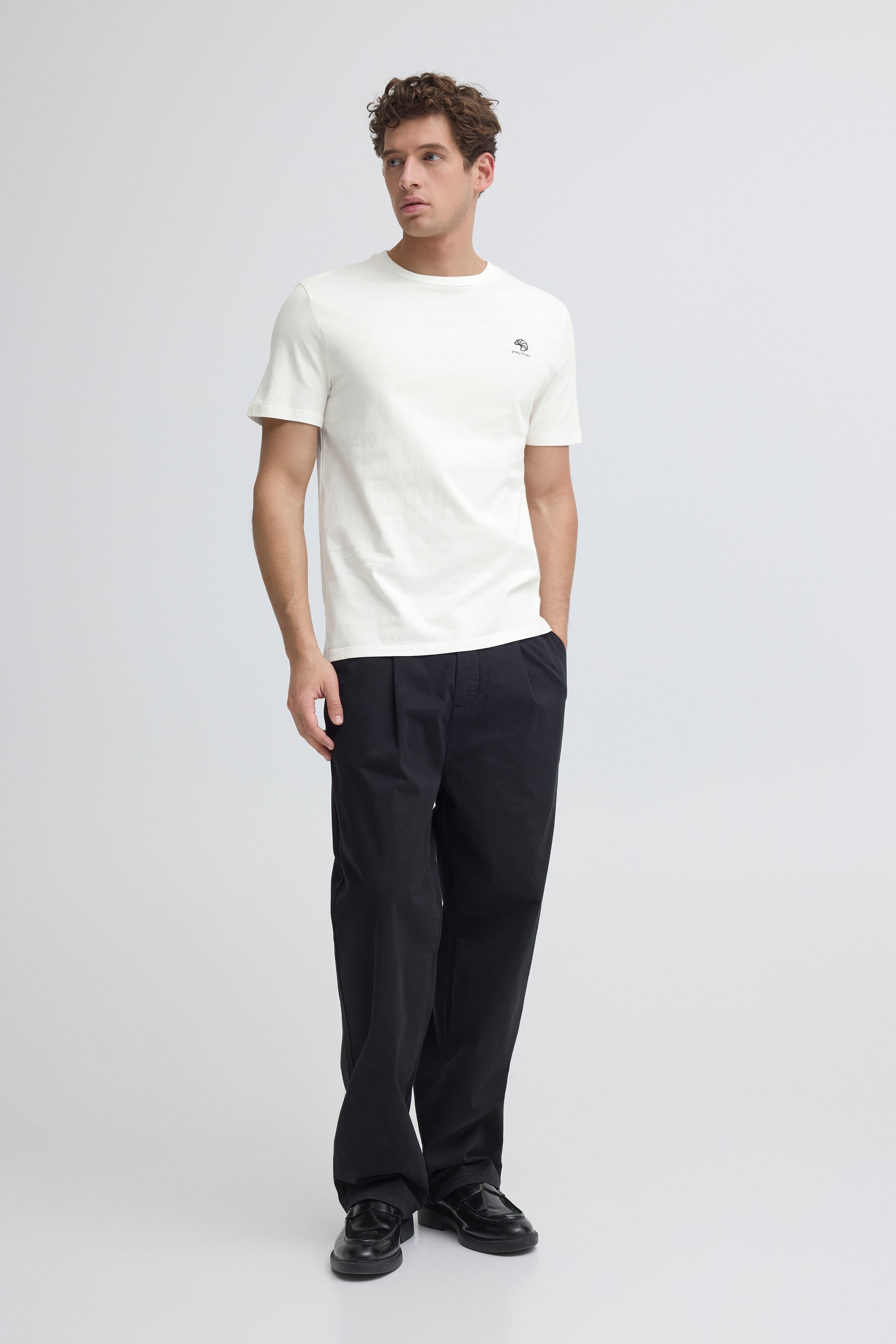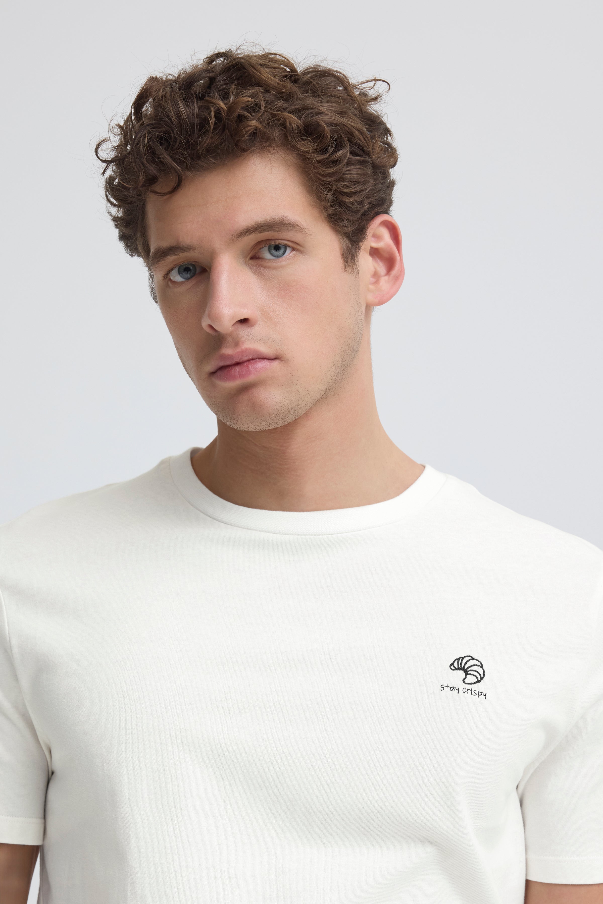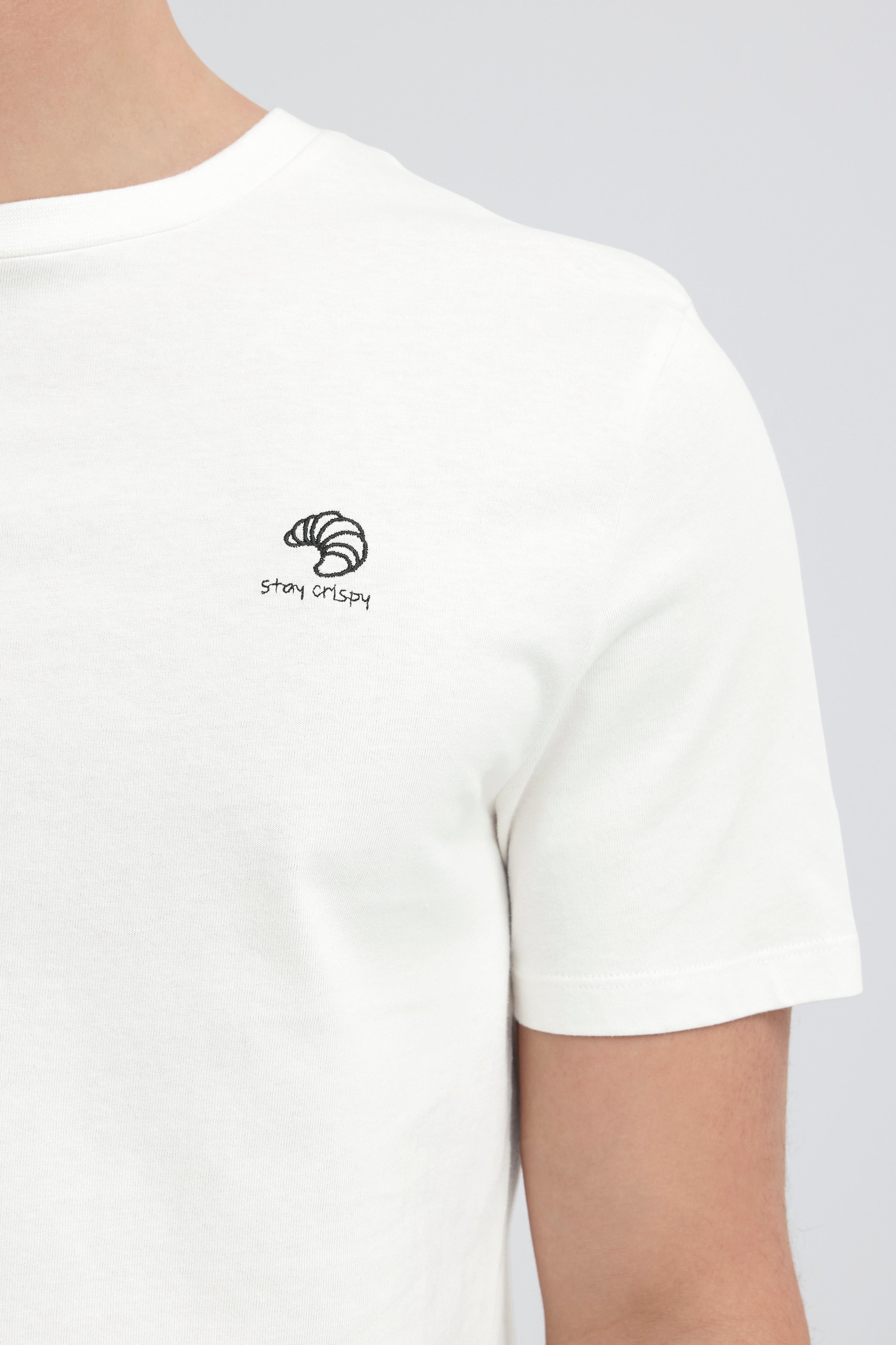 Witte, katoenen t-shirt met subtiele zwarte embroidery op de borst: 'stay crispy'. Ideaal voor iedereen die houdt van een krakende croissant op een zondagochtend!