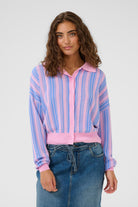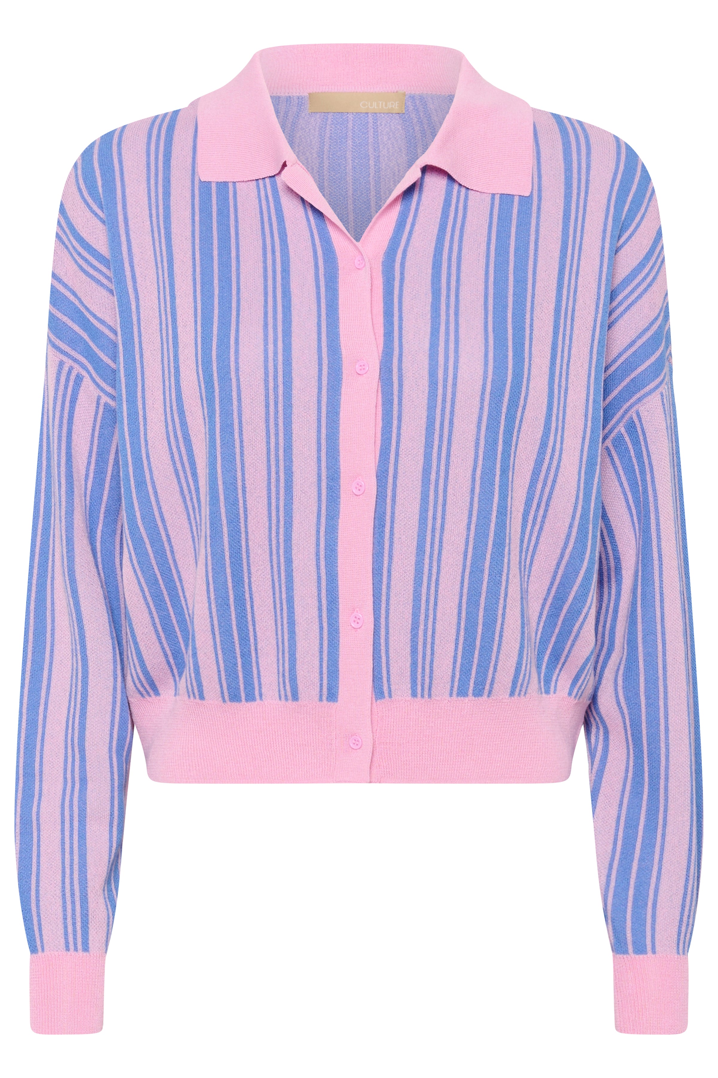 Dit gestreepte damesvest in roze en blauw is een echte eyecatcher voor elk seizoen. De frisse kleurencombinatie en verticale strepen zorgen voor een slank en vrouwelijk silhouet. Het vest heeft een elegante knoopsluiting, een klassieke kraag en een comfortabele pasvorm, waardoor het zowel casual als chic te stylen is.
