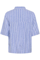 De lichtblauwe stof met fijne witte streep zorgt voor een zachte, zomerse uitstraling die perfect combineert met de Arletty broek of short, maar ook moeiteloos past bij je andere favoriete items.
