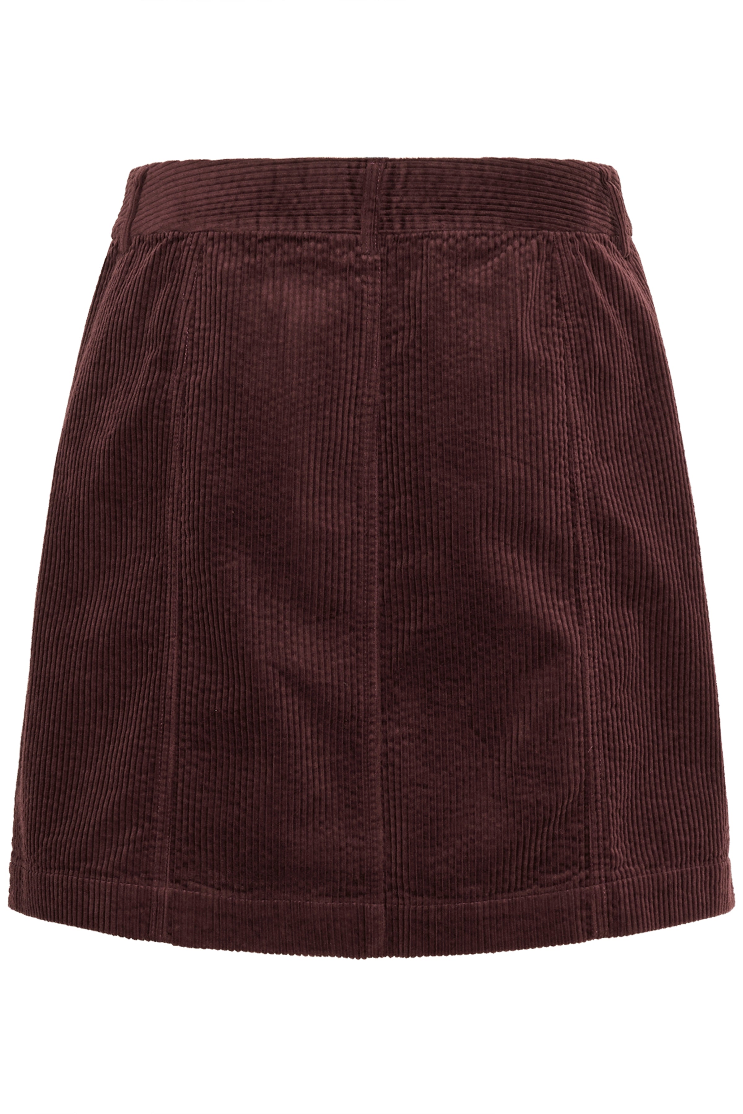 Kort rokje in een bruinbordeaux kleur dat sluit met rits en knoop. Steezakken en enkele sierstiksels vooraan.