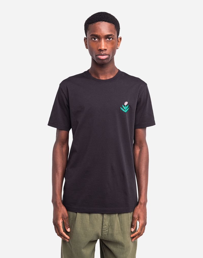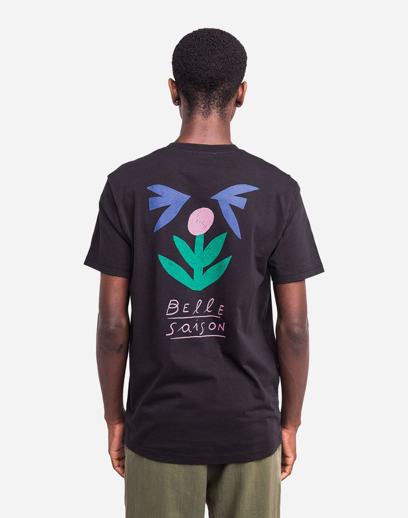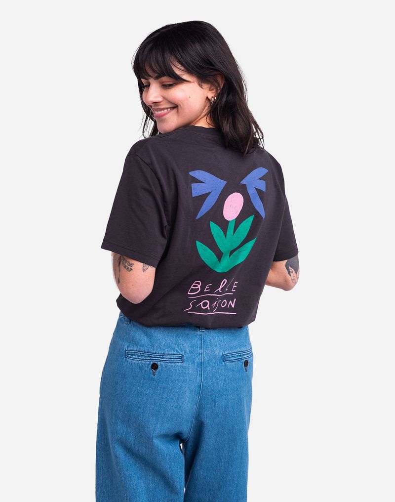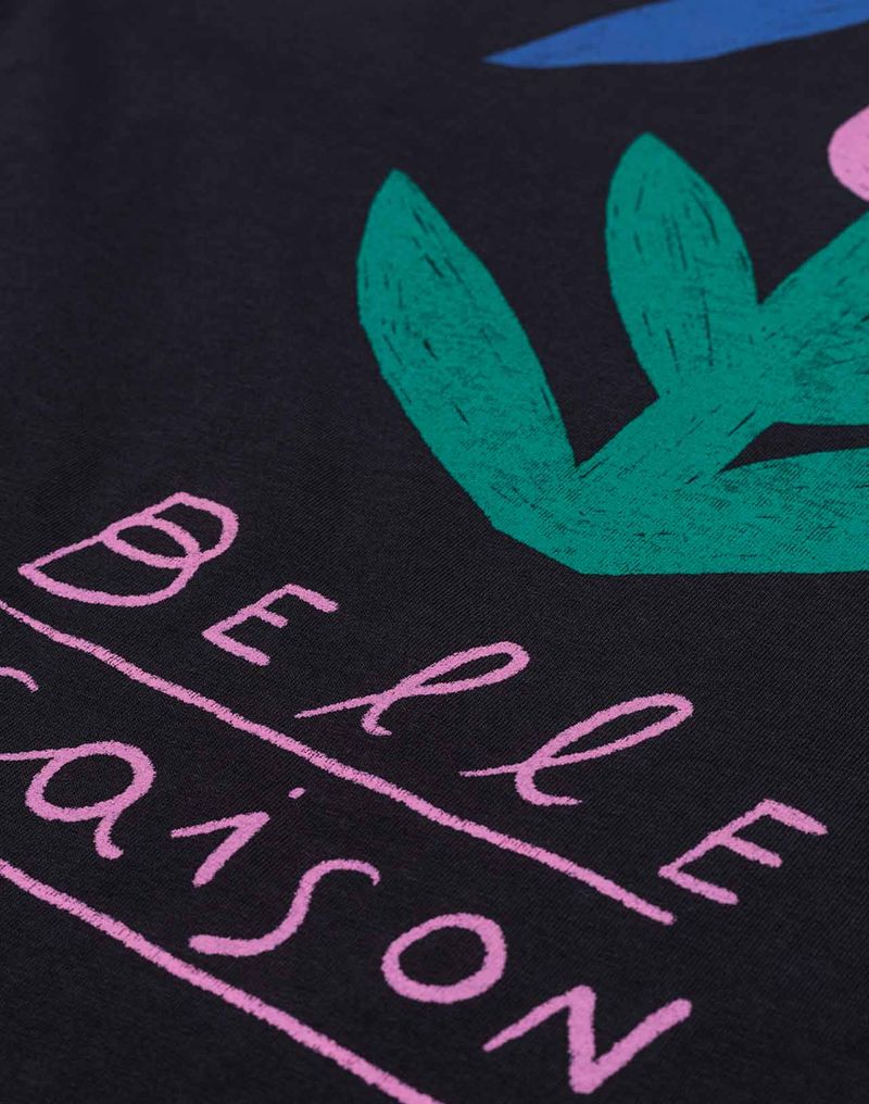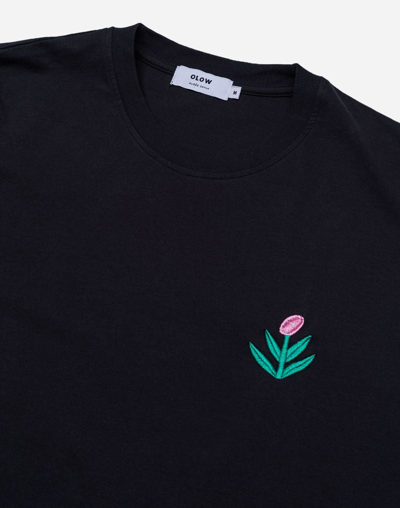 Fijne broderie op de borst, grote print gedrukt op de rug.