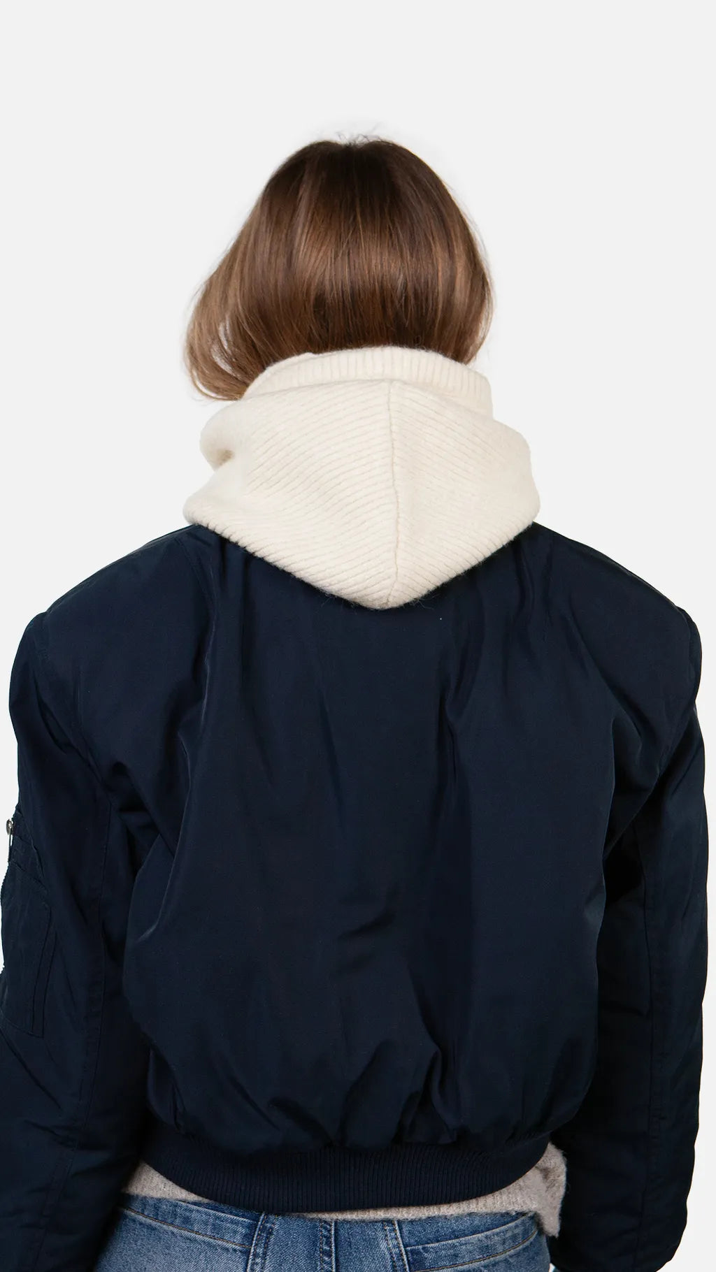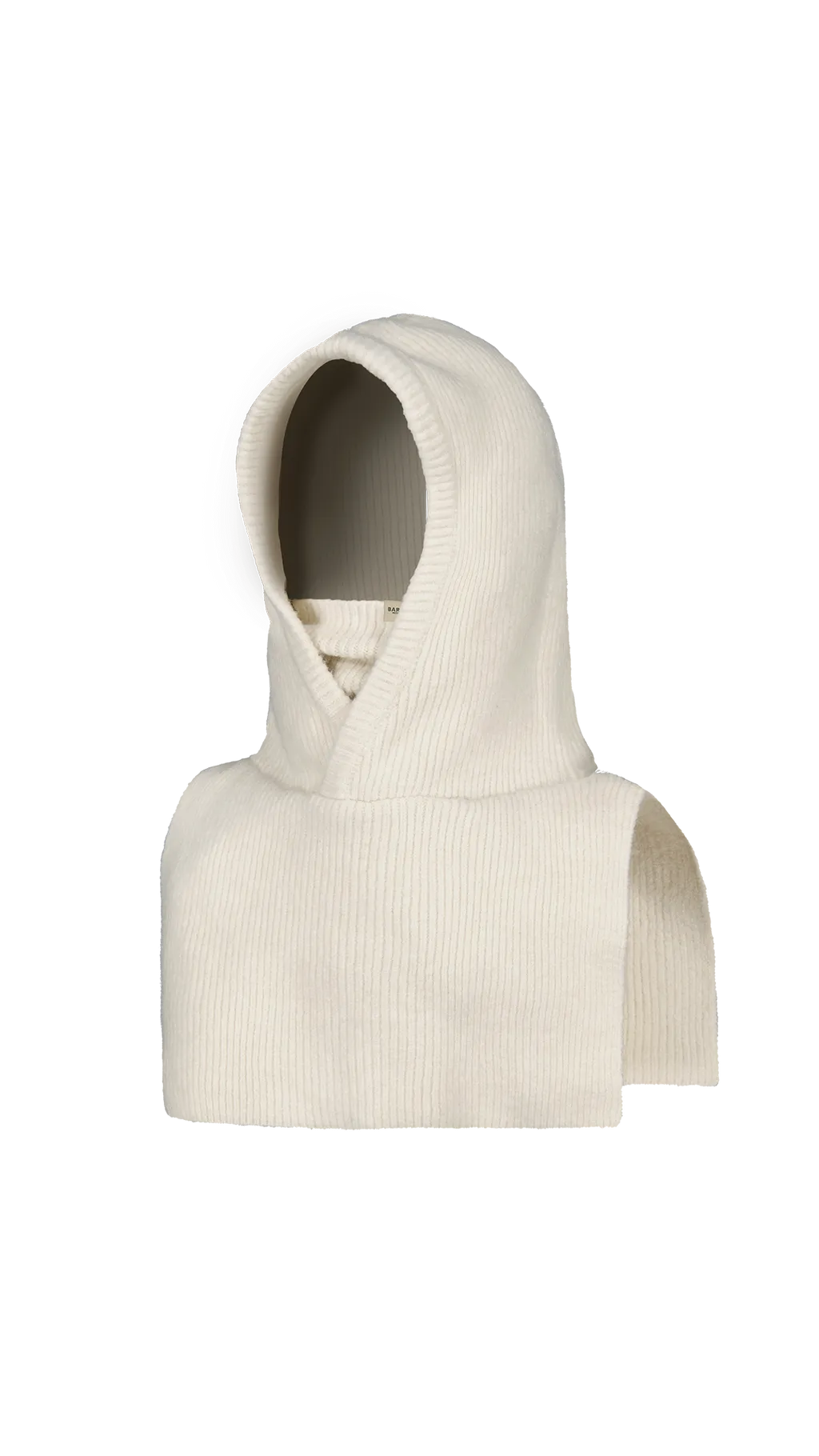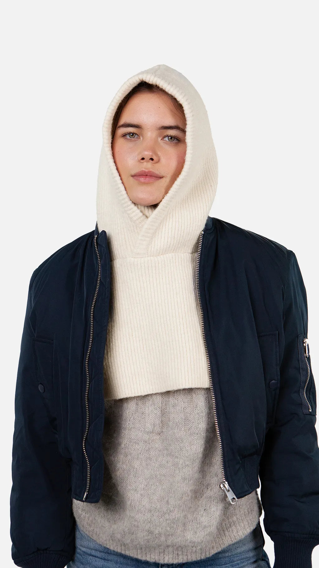 Deze muts heeft een gebreide capuchonkraag met een col. Hij is warm en zacht.