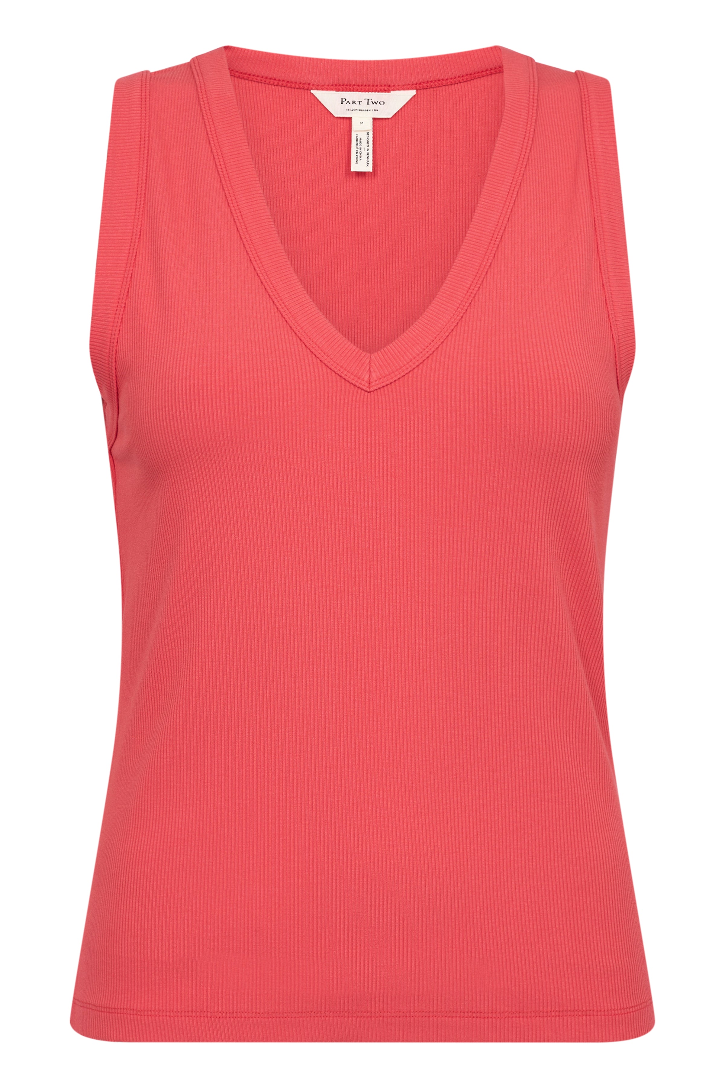 Rode zomertop met V-hals en ribstructuur. Hij sluit mooi aan en voelt super aangenaam aan op de huid door de zachte viscose.