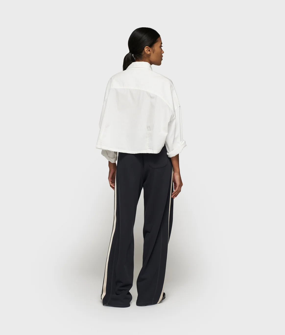 Oversized fit cropped shirt, gemaakt van GOTS-gecertificeerd biologisch katoenen twill bij de body en dry jersey mouwen. Voorzien van een kraag met knoopsluiting, een ronde zoom die achteraan langer is dan vooraan. Verder opgerolde mouwen, een feston 'baseball 10' op de voorkant en een '10' monogram geborduurd op de linkermouw.