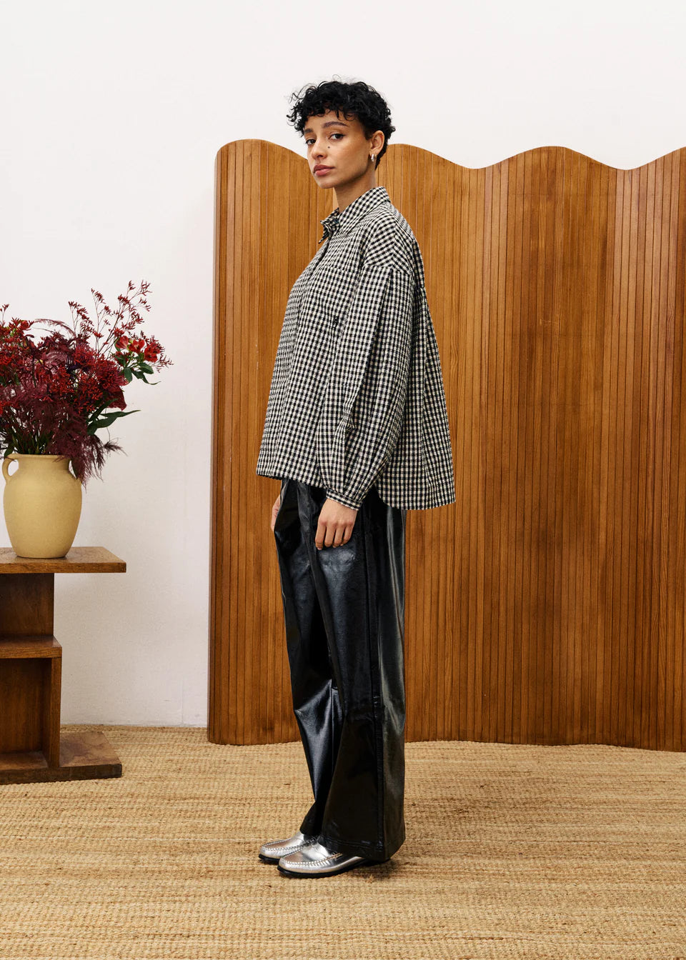 De Raven blouse is een stoerder overhemd in een exclusieve FRNCH-stof. Ze heeft een wijde fit, een hemdskraag en lange ballonmouwen met knoopjes.