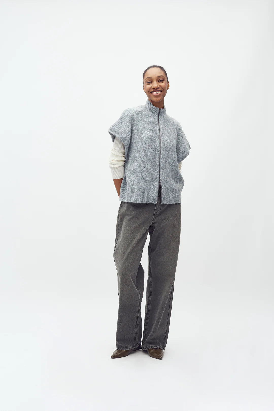 Zachte mouwloze vest met rits. De vest is in ribbelsteek, aan de armsgaten is de ribbel horizontaal, wat een leuke, stoere touch is.