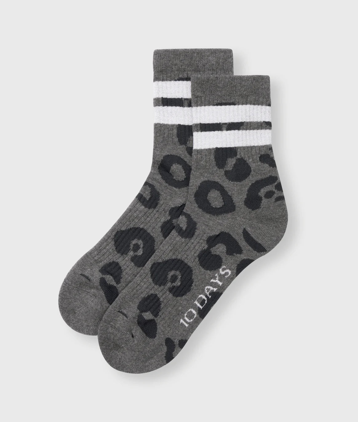 Ribgebreide sokken met leopardprint en logo onder de voet. Ontworpen met een geribde boord en glanzende lurexdetails in zilver.
