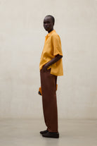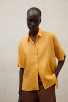 Een oranjegeel linnen hemd om de warme dagen te trotseren in een vrolijke vibe.