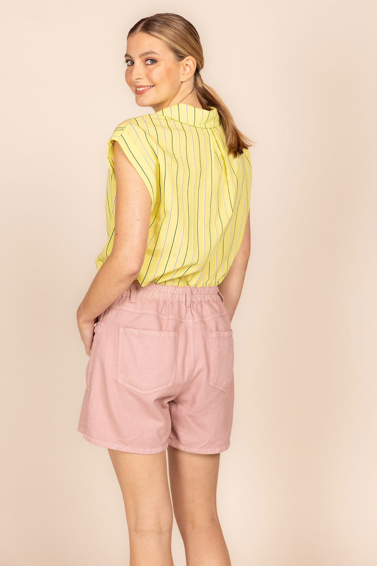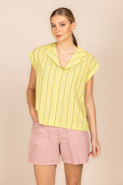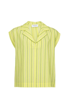 Met haar flatterende V-hals, relaxte drop shoulders en verfijnde mini-kraagje met elegante opslag balanceert deze blouse moeiteloos tussen een top en een hemd. Het streepdessin in de trendkleur geel geeft je outfit instant energie en een frisse, eigentijdse uitstraling.