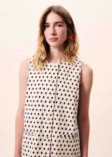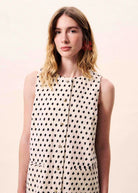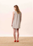 Dit Tamarinia kleedje is een mouwloze, rechte, korte jurk met een zwart geometrisch patroon op een witte achtergrond. Het heeft een patroon van kleine, contrasterende zwarte ruitjes over de hele jurk en een ronde hals. Er is een drukknoopsluiting aan de achterkant van de halslijn.