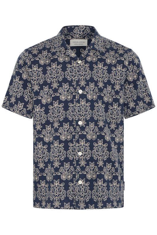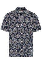 Met dit navy herenhemd met korte mouw en print straal je zelfvertrouwen en zomerse energie uit — een absolute must-have voor de durvers.