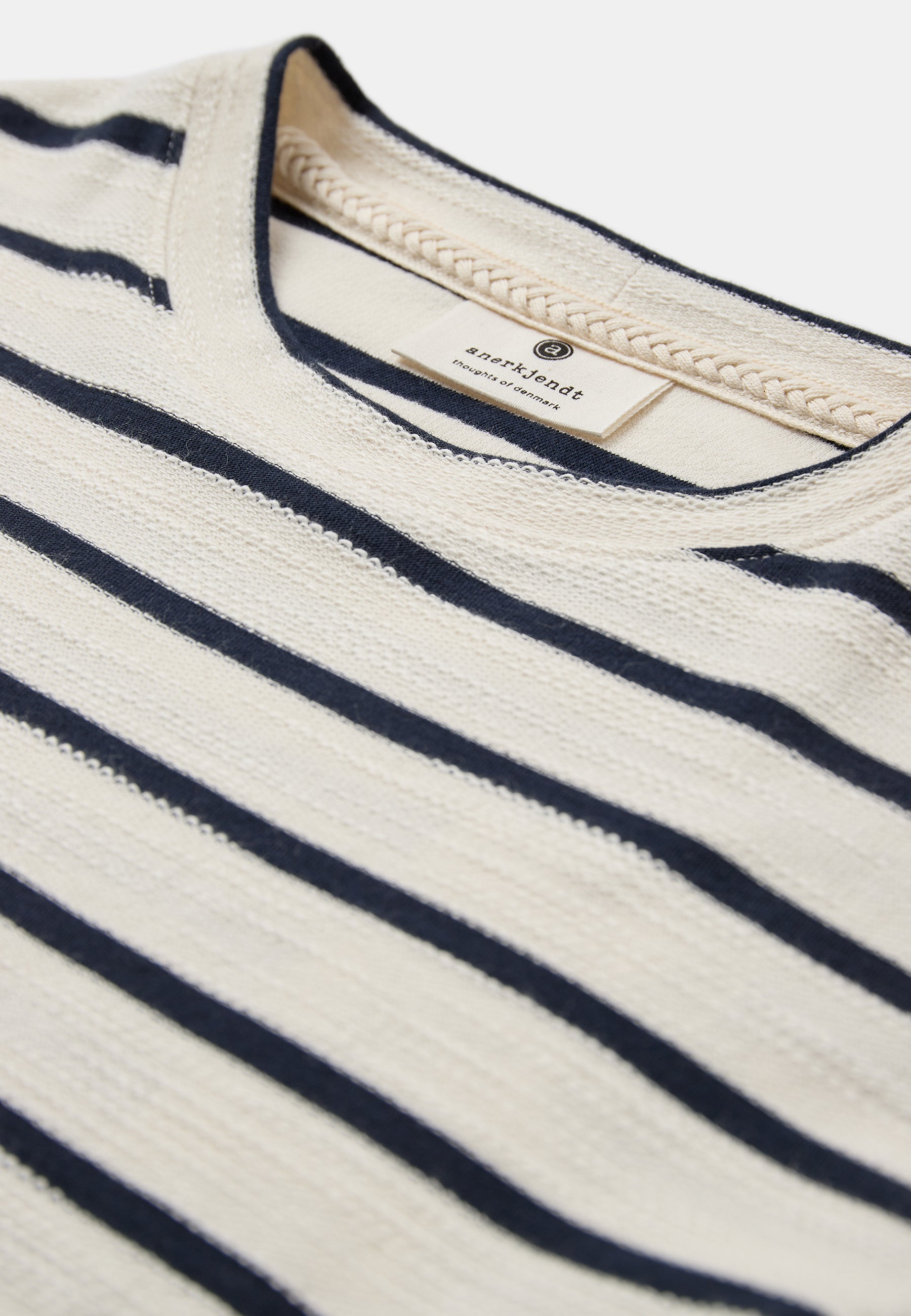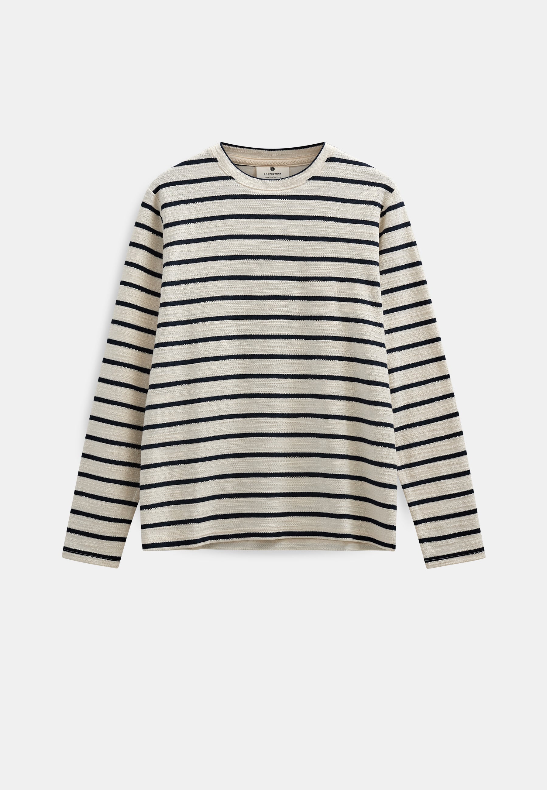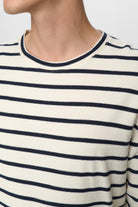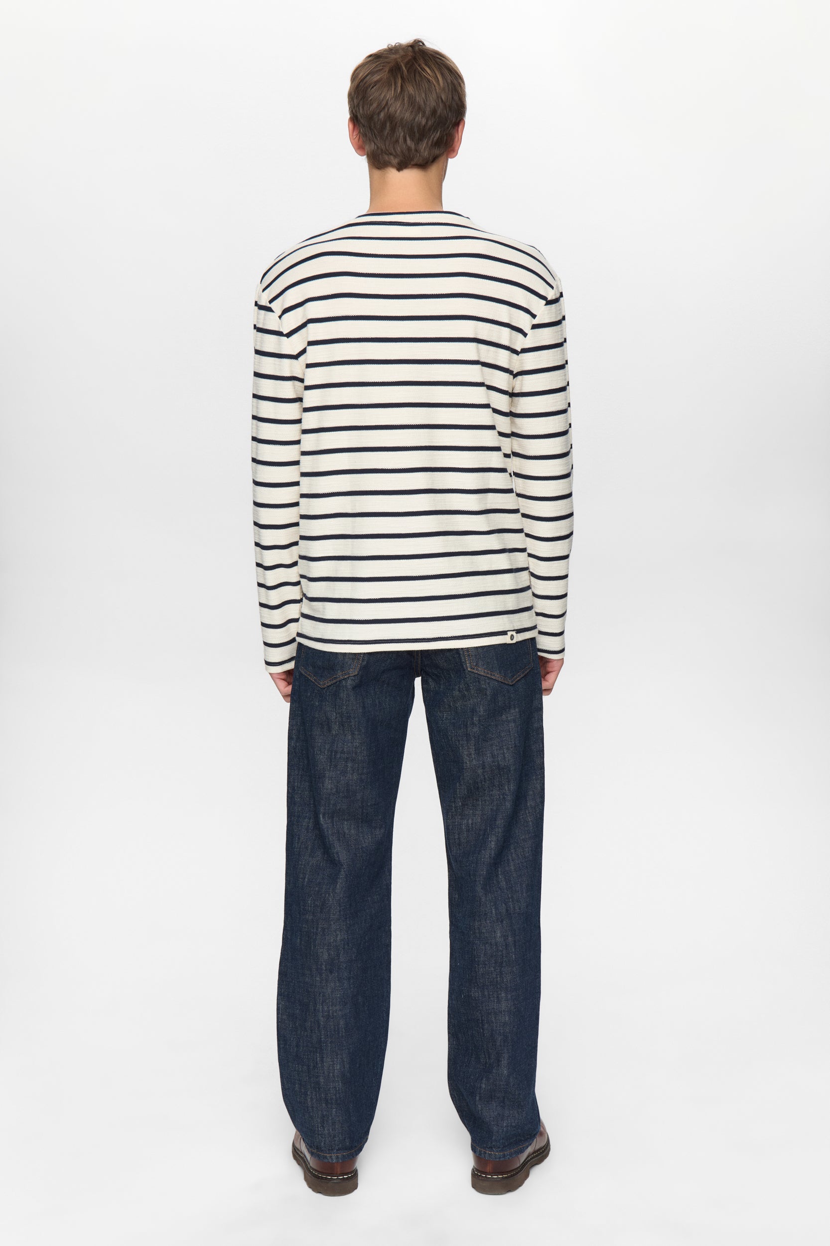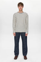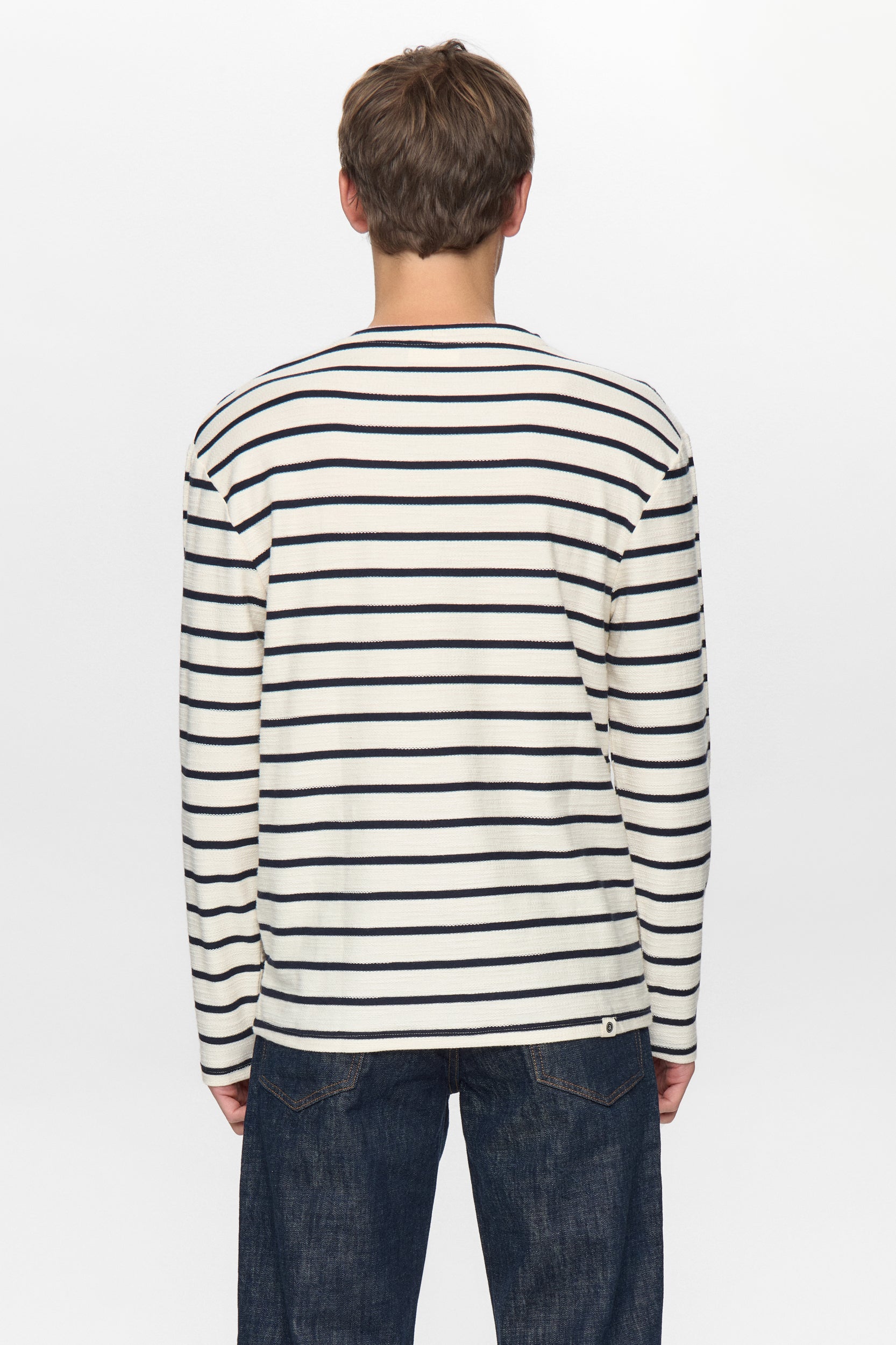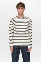 De Sander Sweater van Anerkjendt is het perfecte voorbeeld van hoe een comfortabele sweater stijlvol én veelzijdig kan zijn. Deze blauw met gebroken witte gestreepte trui biedt een frisse, tijdloze look die moeiteloos aansluit bij elke garderobe. De afgeronde strepen geven de sweater een subtiel nautisch karakter, zonder te overdreven te zijn – precies die Scandinavische eenvoud waar Anerkjendt om bekendstaat.