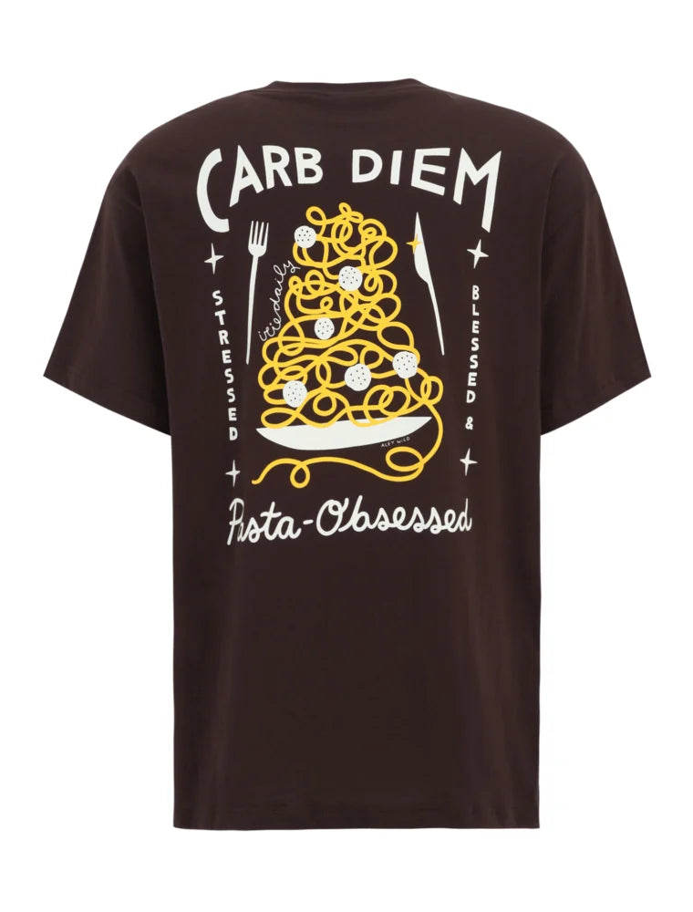 De grote print op de achterkant van Aley Wild straalt een echte pasta-levensstijl uit - gewoon koolhydraten eten! Je kunt dit veganistische T-shirt met een gerust hart dragen, net als koolhydraten eten, want het is gemaakt van 100% biologisch katoen en geproduceerd in Portugal onder eerlijke arbeidsomstandigheden.