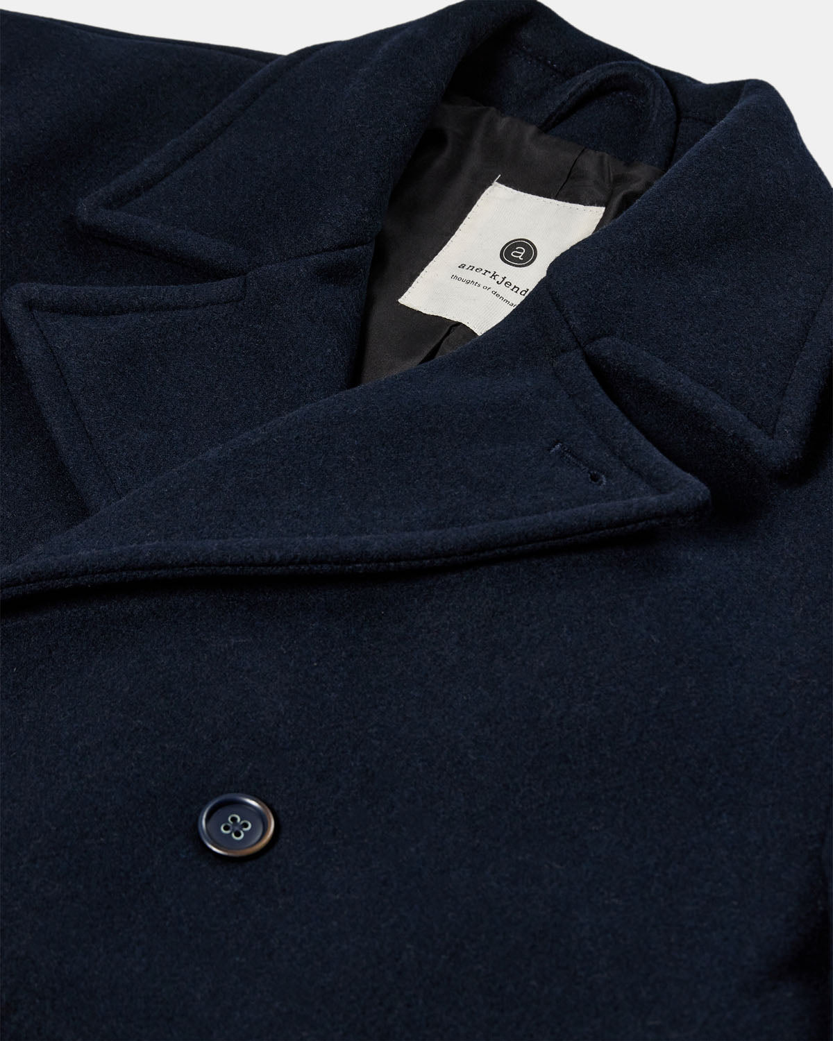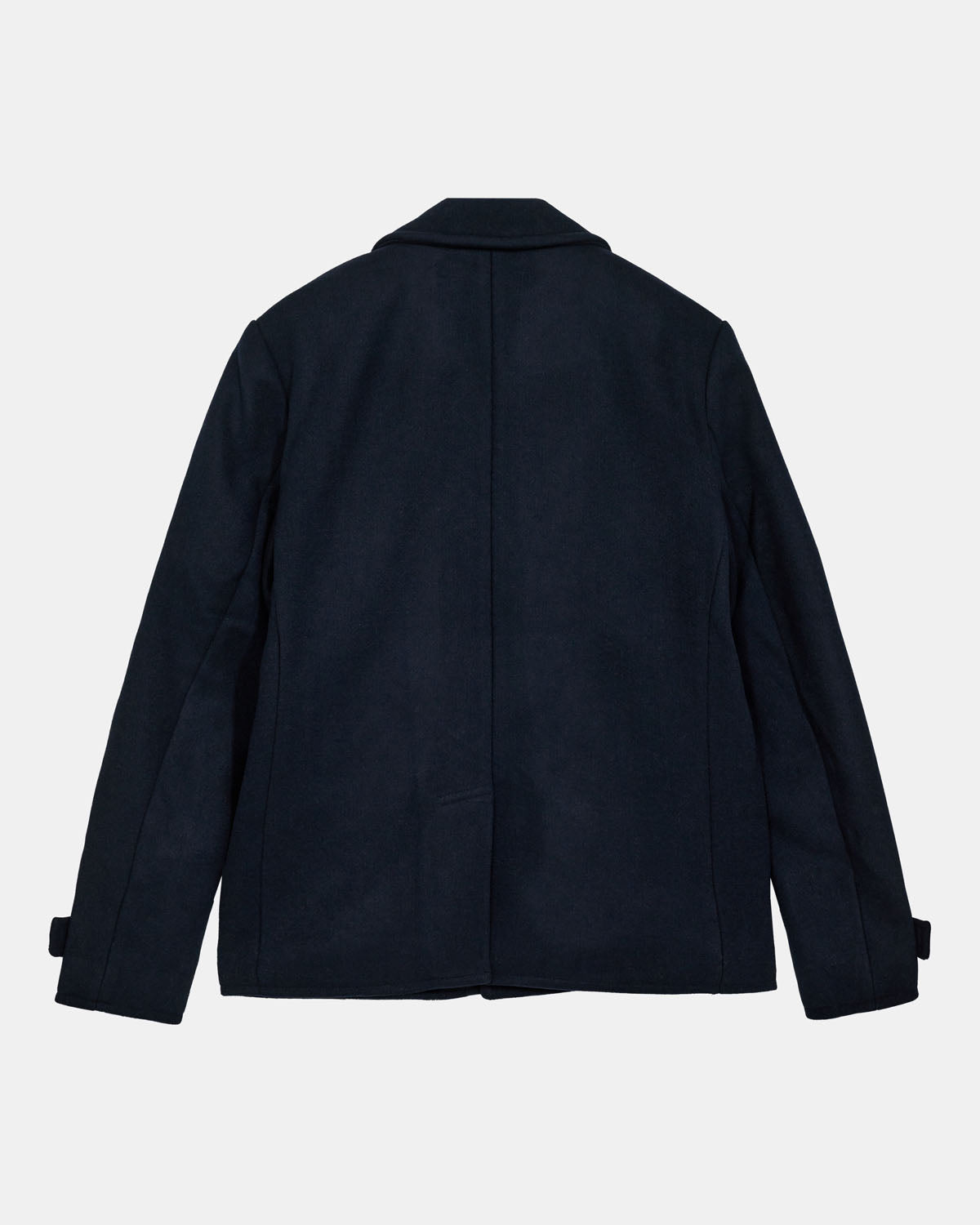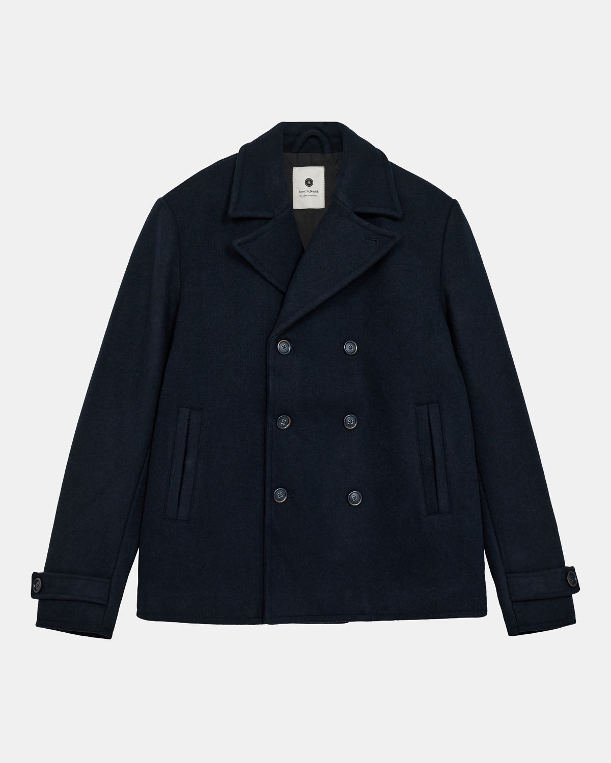Maak je outfit compleet met deze donkerblauwe wollen jas – een stijlvol en tijdloos item dat niet mag ontbreken in je garderobe. Het korte model met dubbele knopenrij geeft de jas een elegante, moderne uitstraling, terwijl de steekzakken zorgen voor extra praktisch gemak.