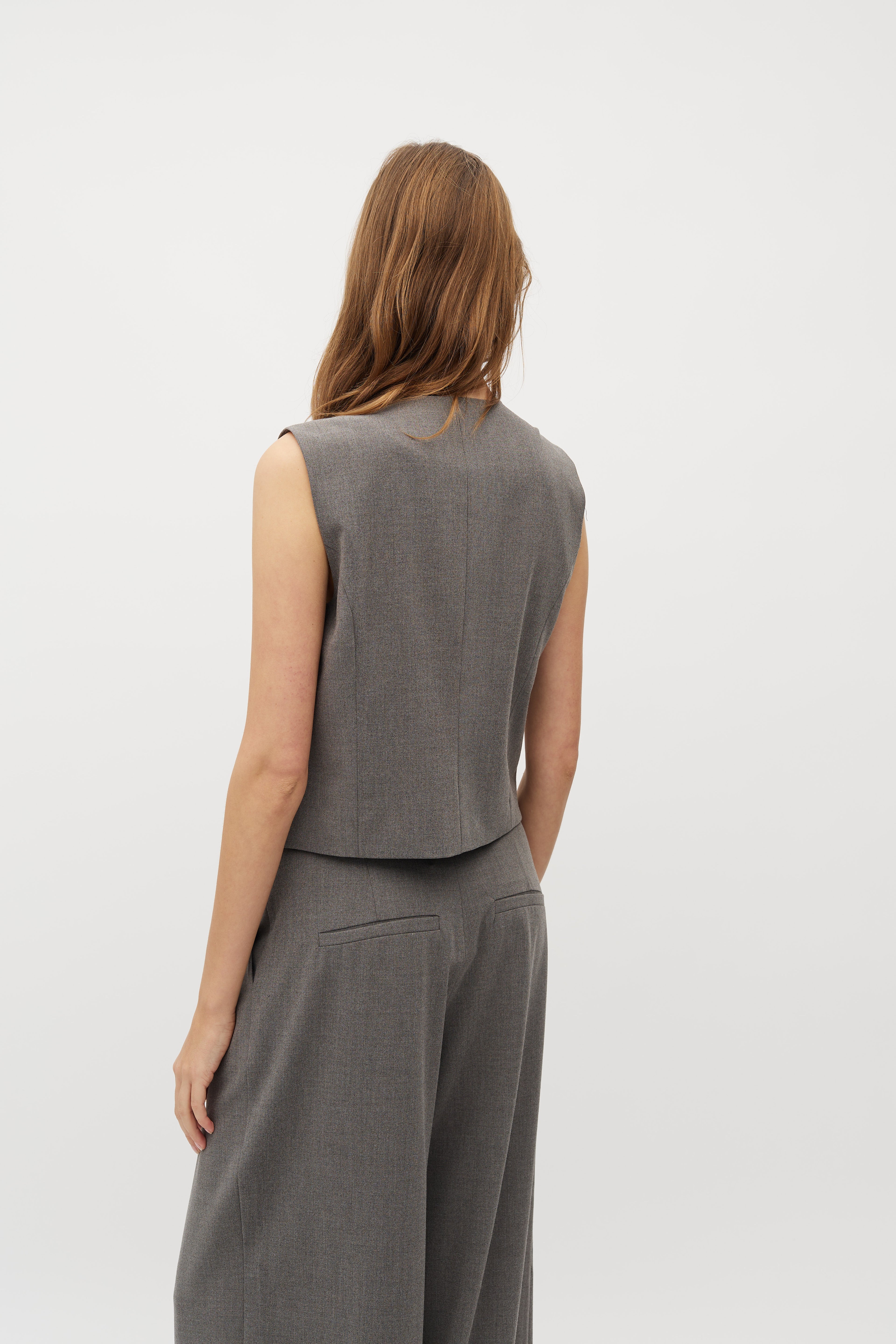 Deze grijze Aleia waistcoat is een leuk stuk om te combineren bij de Rosalyn broek. De sluiting zorgt voor dat tikkeltje extra. Dit kostuum is er eentje dat je niet snel beu wordt en makkelijk kan combineren met bordeaux, één van de trendkleuren van deze herfst.