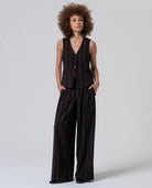 Weer een pareltje van een vrouwenpak. Deze Irdi broek heeft een donkerbruine kleur en een elegant verticaal lijnenpatroon. Combineer met de elegante Irdi gilet en je hebt je meest stijlvolle outfit van FW25!