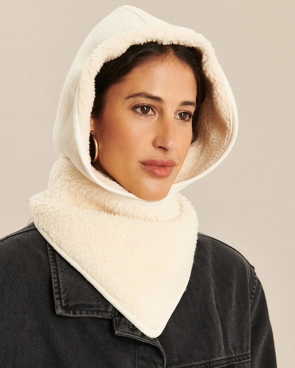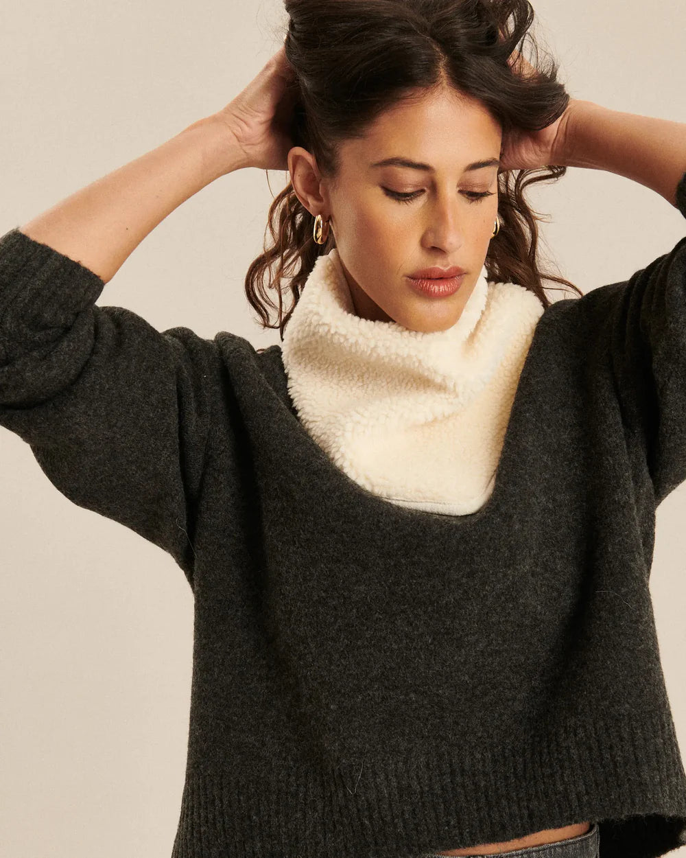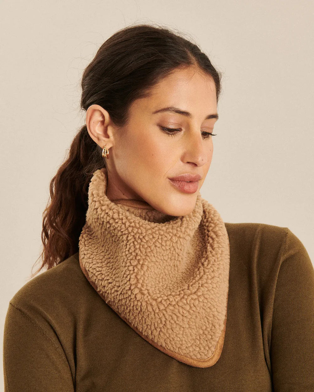 De Alexis sherpa is een omkeerbaar sjaaltje dat je outfit helemaal kan afwerken. Aan de éne kant teddy, aan de andere kant suède. Het sluit met een drukknop. Het accessoire dat een eenvoudig silhouet verwarmt en diepte geeft.