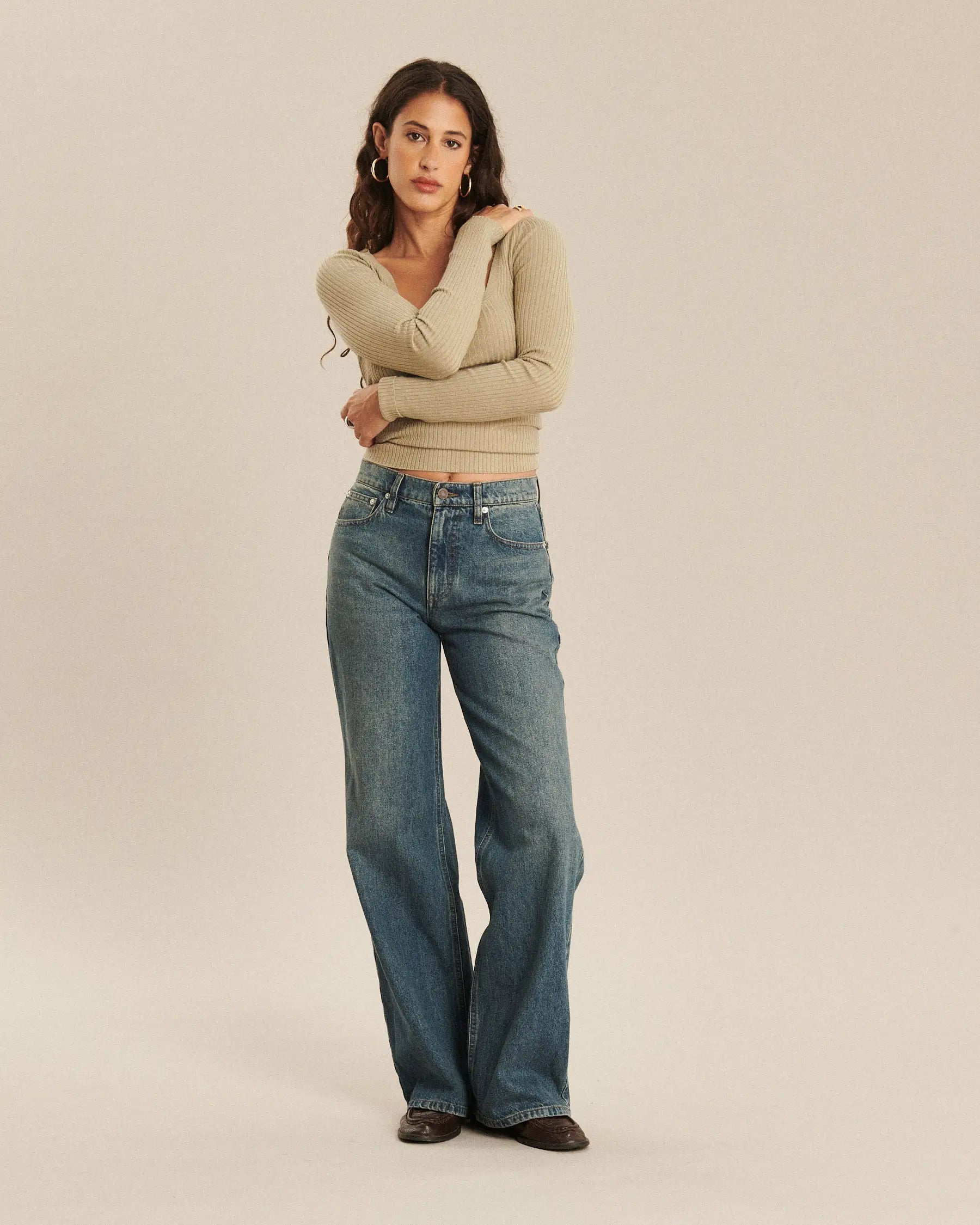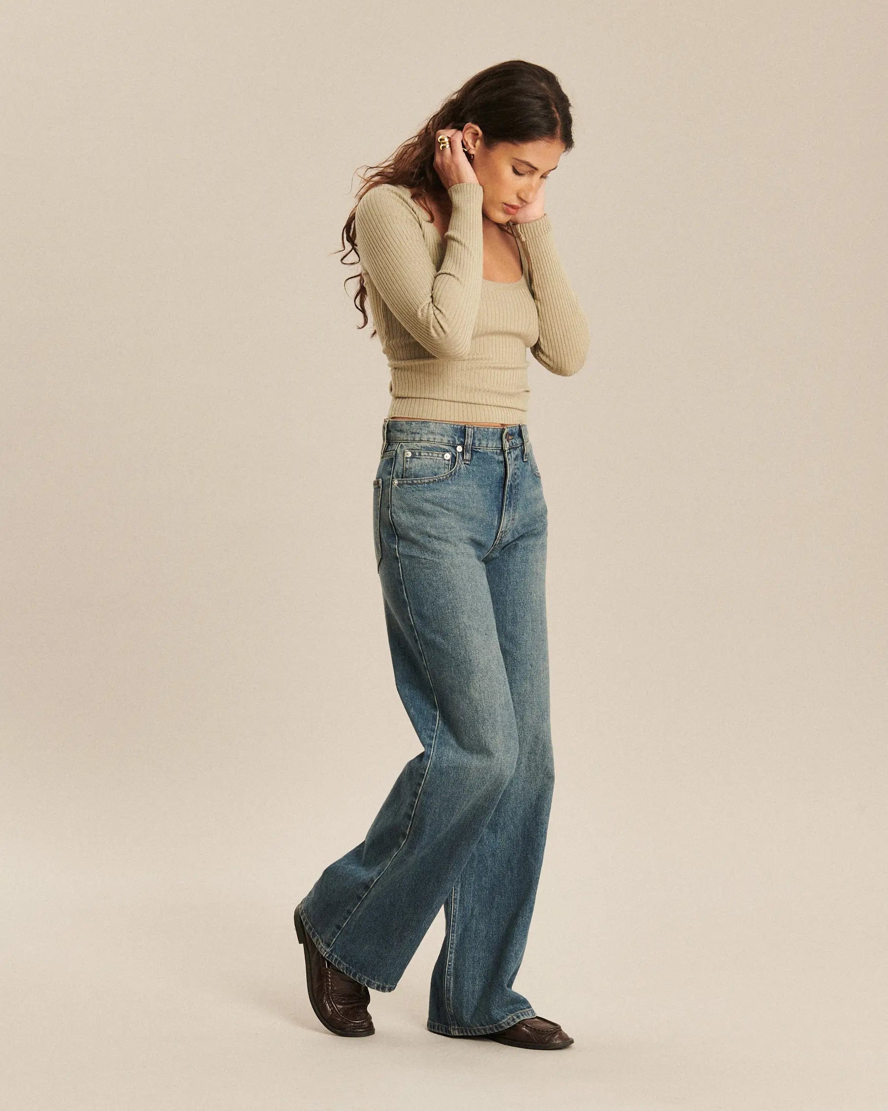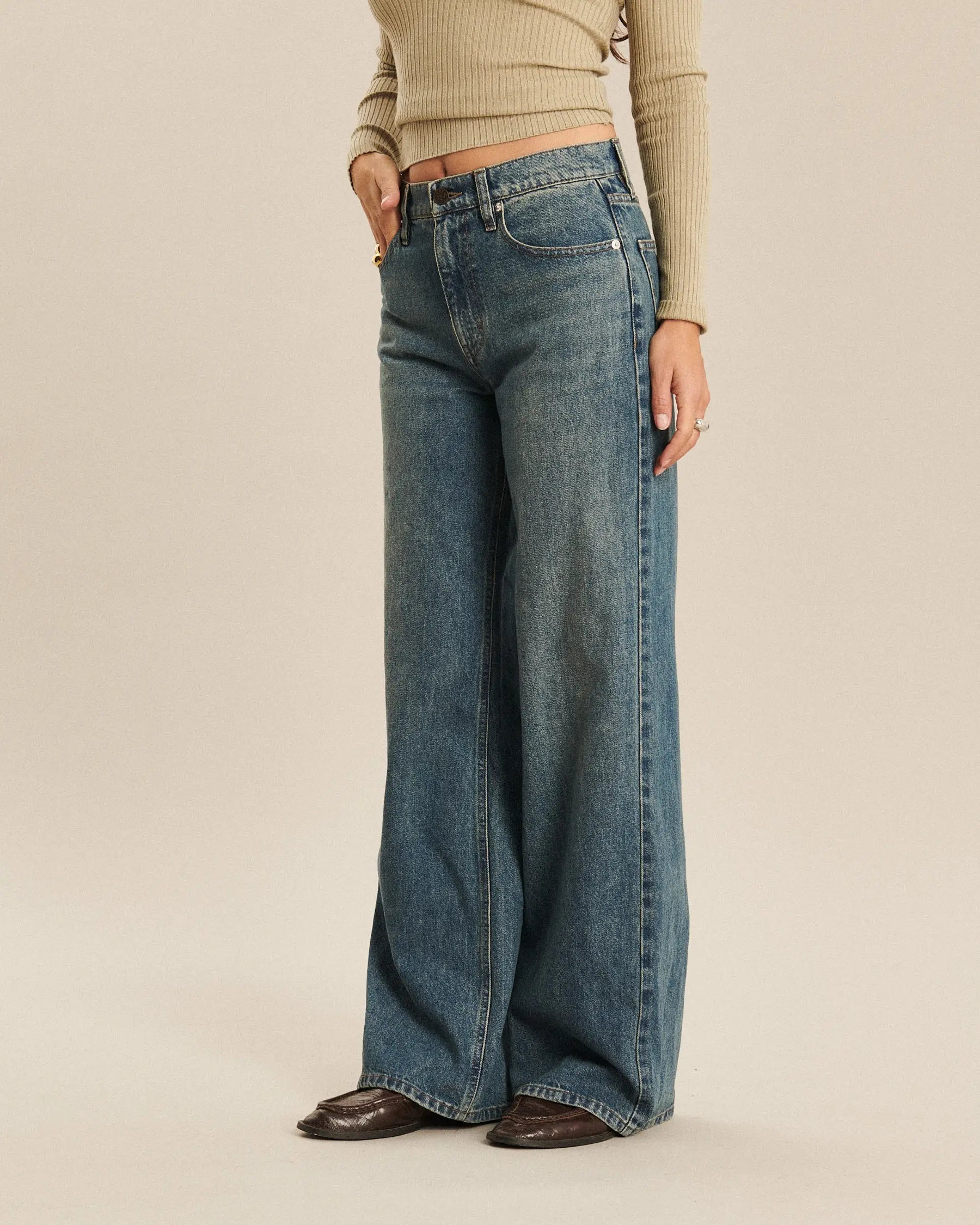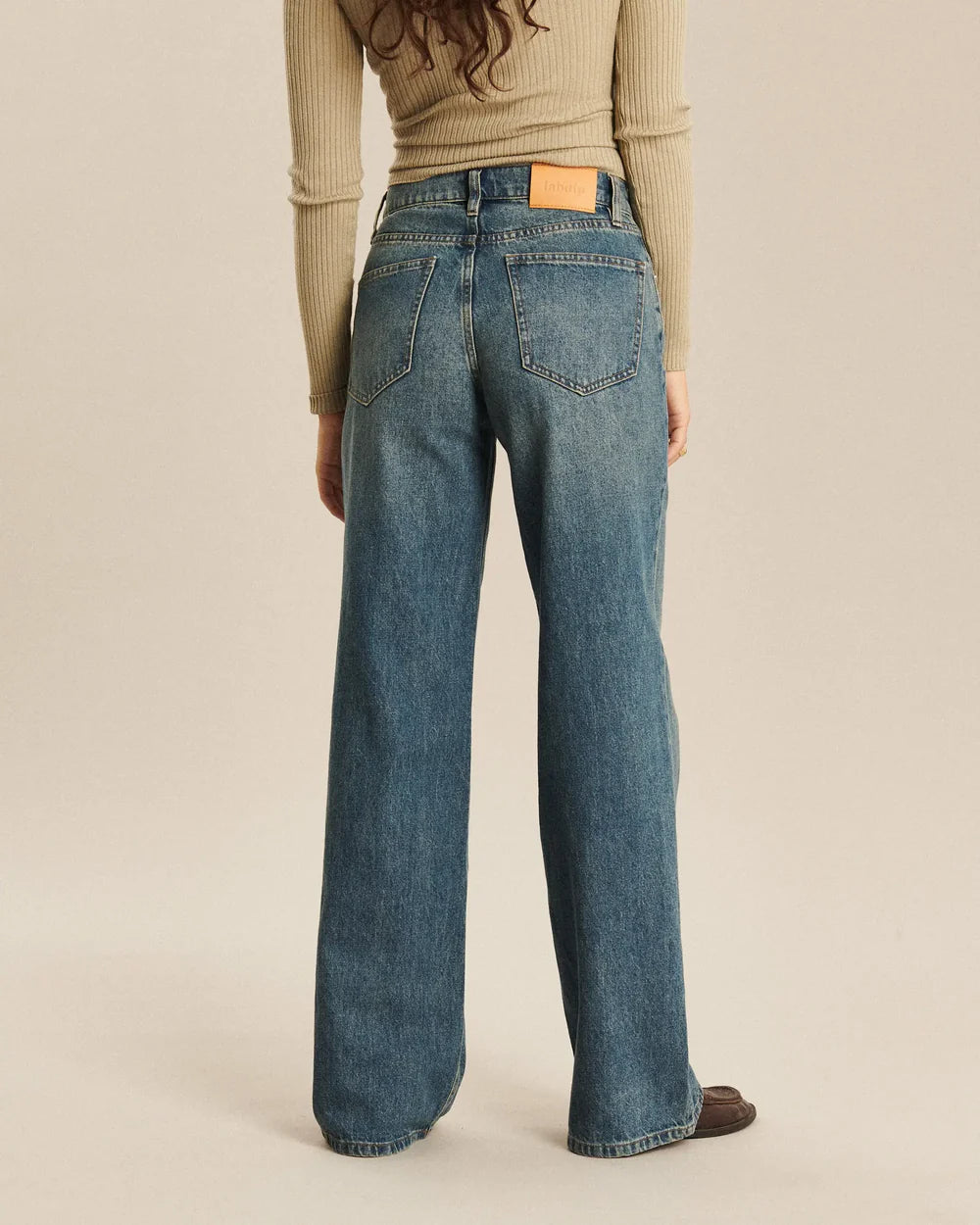 Versleten middenblauw voor een natuurlijk gedragen, vintage effect.