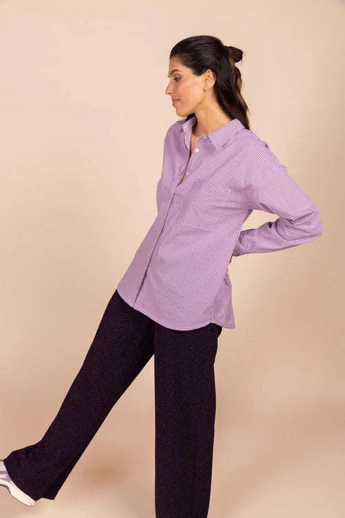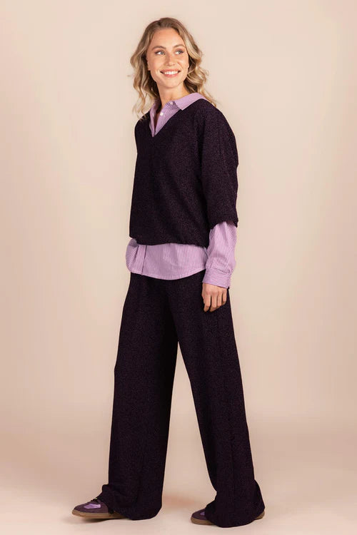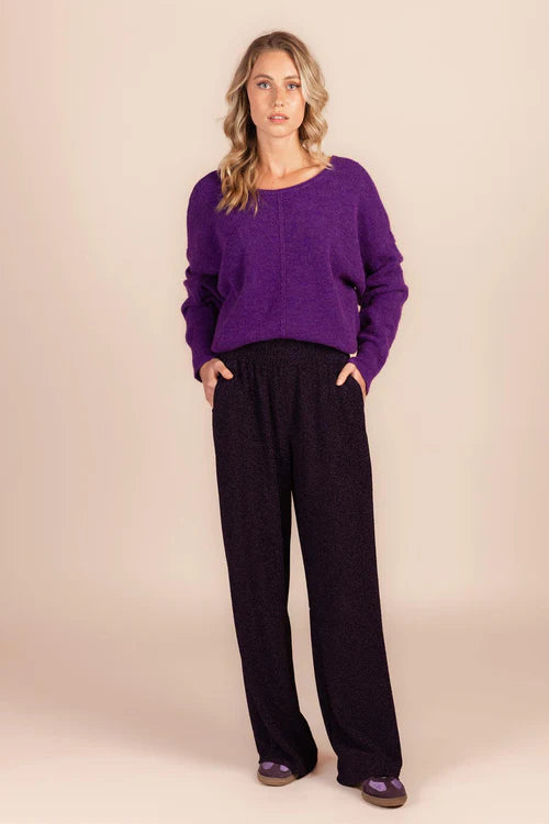Soft sparkle! Een broek die zowel straalt als zacht aanvoelt? Yes please. De paarse, soepele stof heeft een subtiele glans en voelt als een tweede huid. Loose fit, elastische tailleband en steekzakken zorgen voor de perfecte shape. Met blouse 8597 erbij? Match made in heaven.