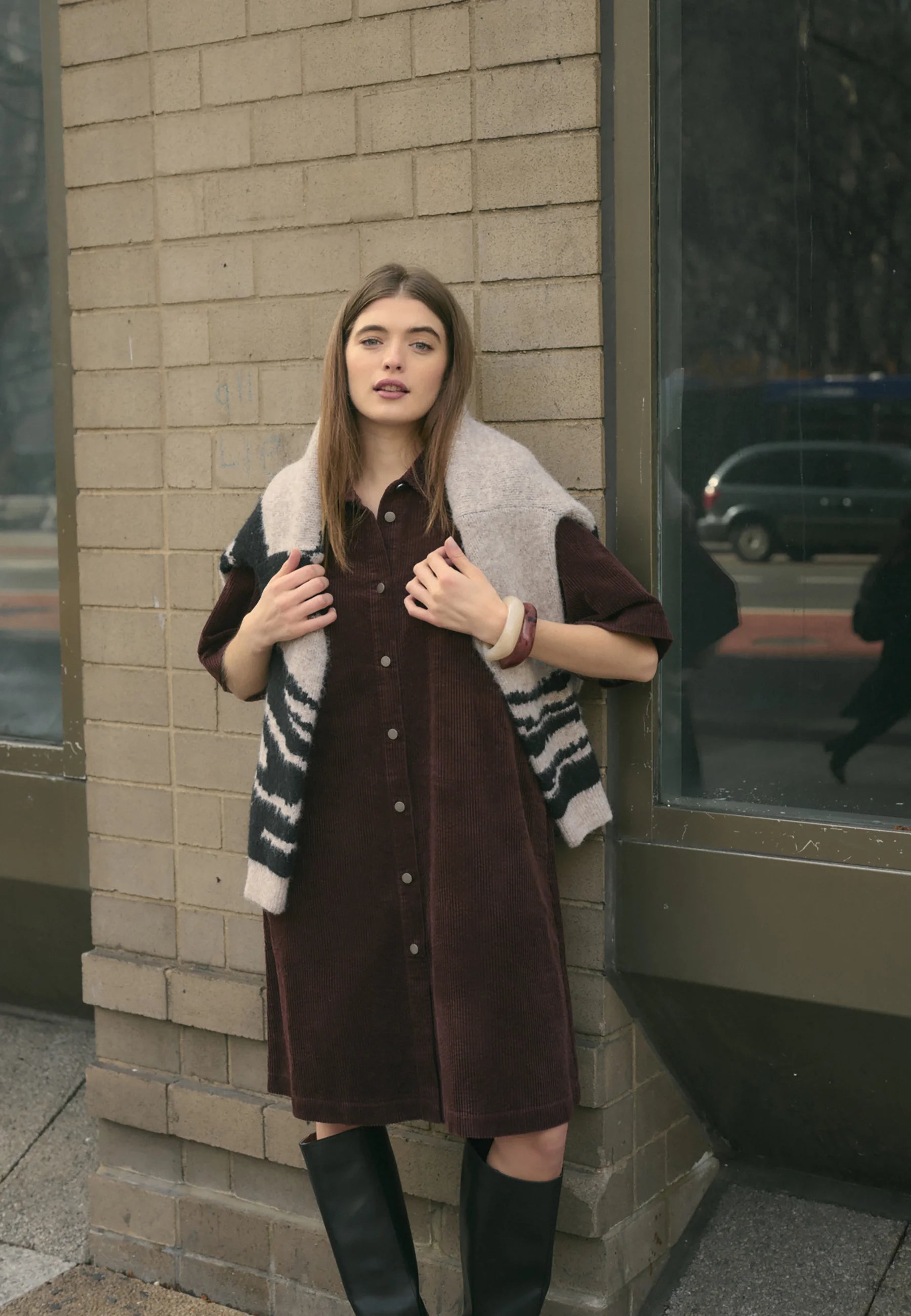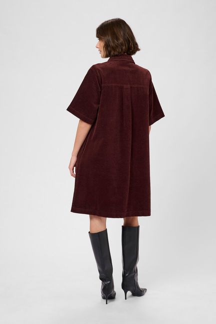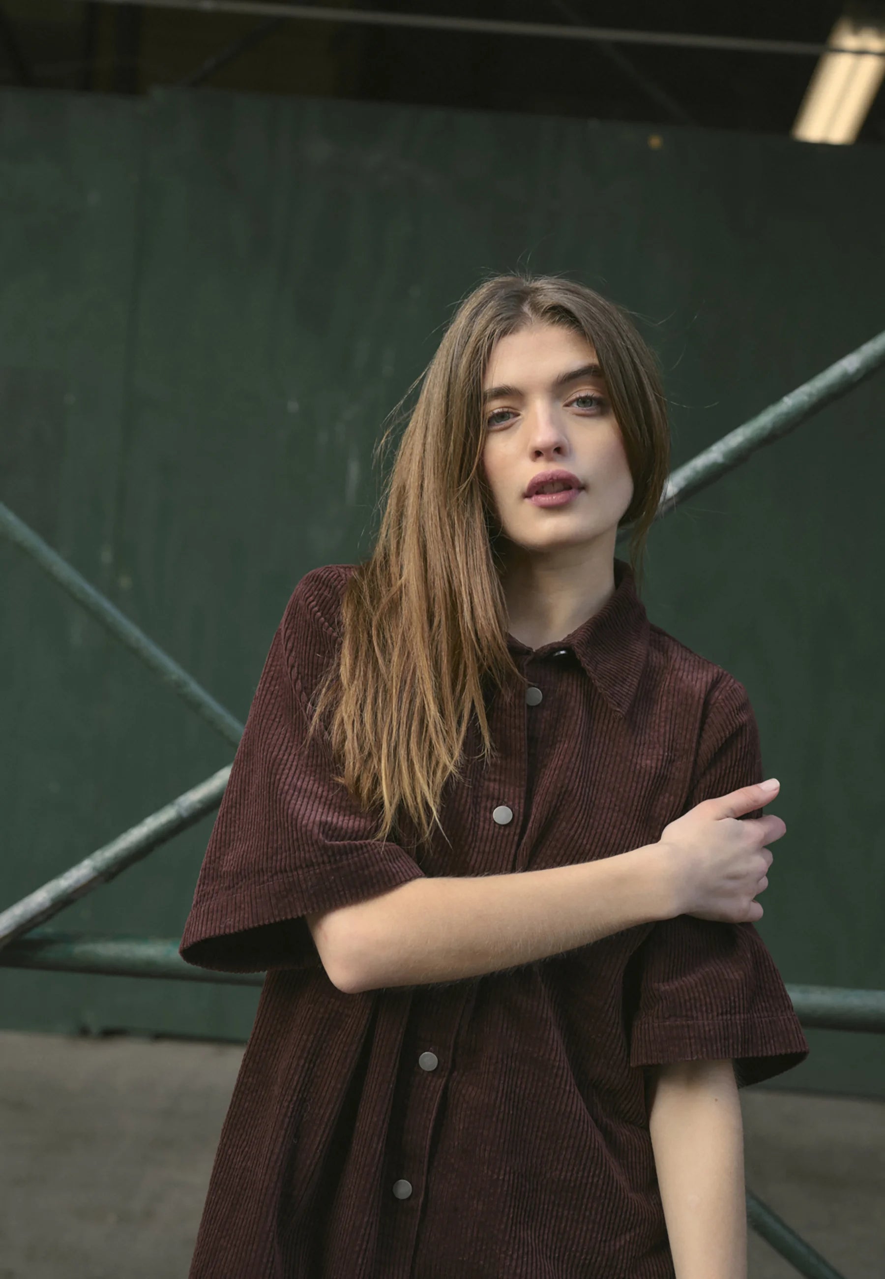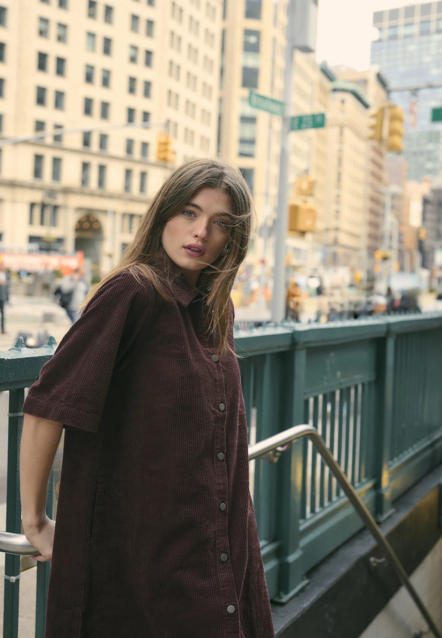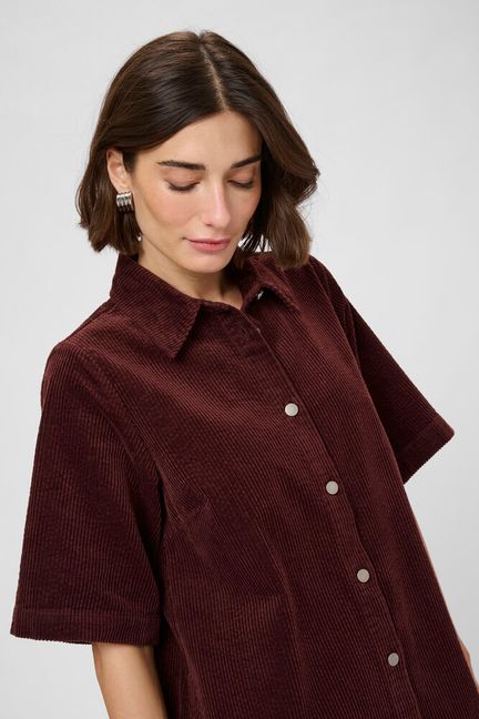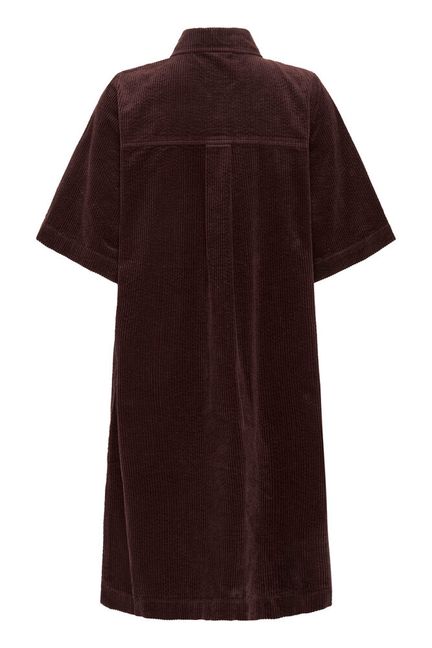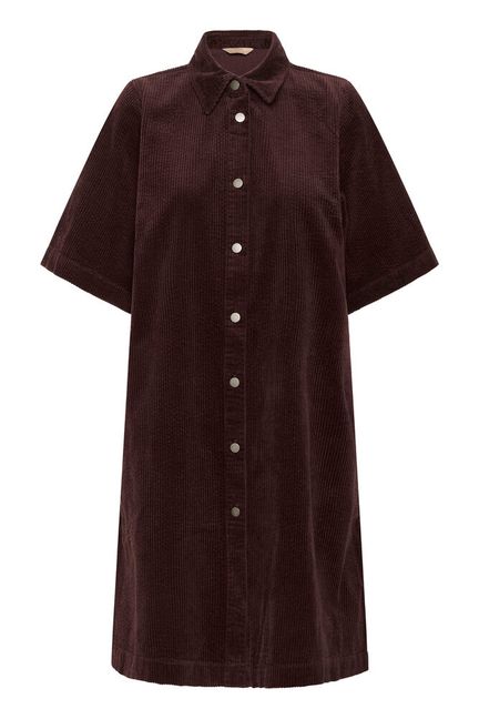 Ervaar het perfecte samenspel van stijl en comfort met deze hemdjurk. De zachte ribfluwelen stof voelt heerlijk aan en geeft de jurk een luxe uitstraling. Dankzij de klassieke kraag, de doorknoopsluiting en de korte, wijde mouwen krijgt het ontwerp een nonchalante maar toch verfijnde look. De warme bruine tint zorgt ervoor dat dit item eindeloos te combineren is. Draag de jurk losjes voor een relaxte uitstraling of creëer extra vorm door een riem in de taille te dragen. Een veelzijdige must-have die je zonder moeite een elegante uitstraling geeft.