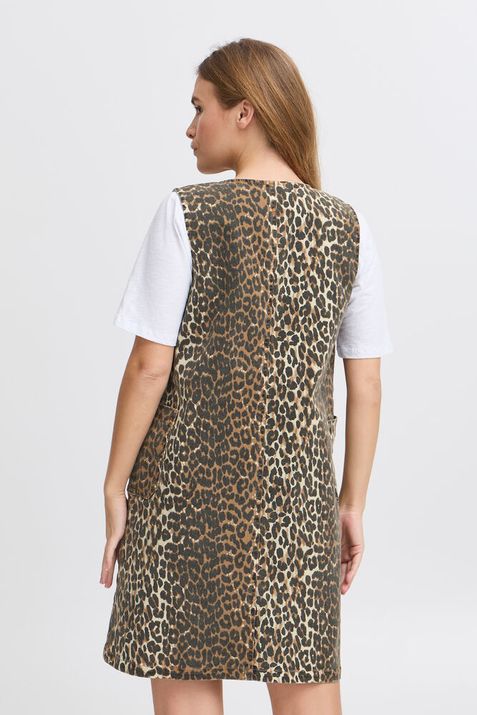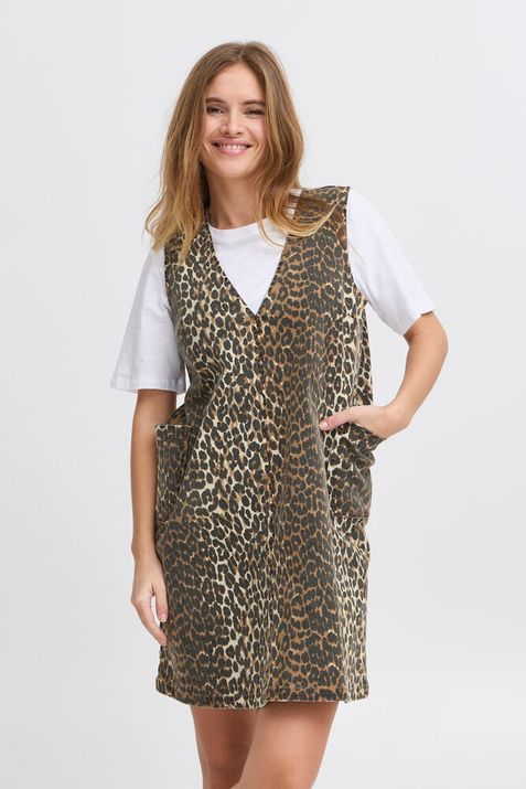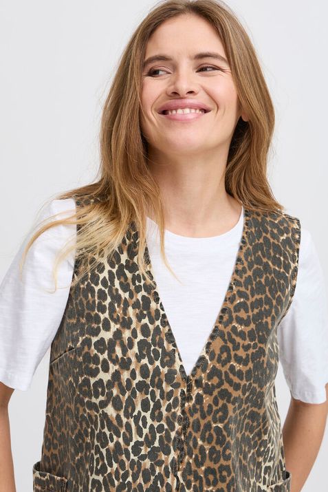 Deze mouwloze jurk is een echte musthave voor elke garderobe. De jeansstof met luipaardprint geeft de jurk een stoere én vrouwelijke uitstraling. De V-hals en zijzakken maken het model niet alleen stijlvol, maar ook comfortabel in het dragen.