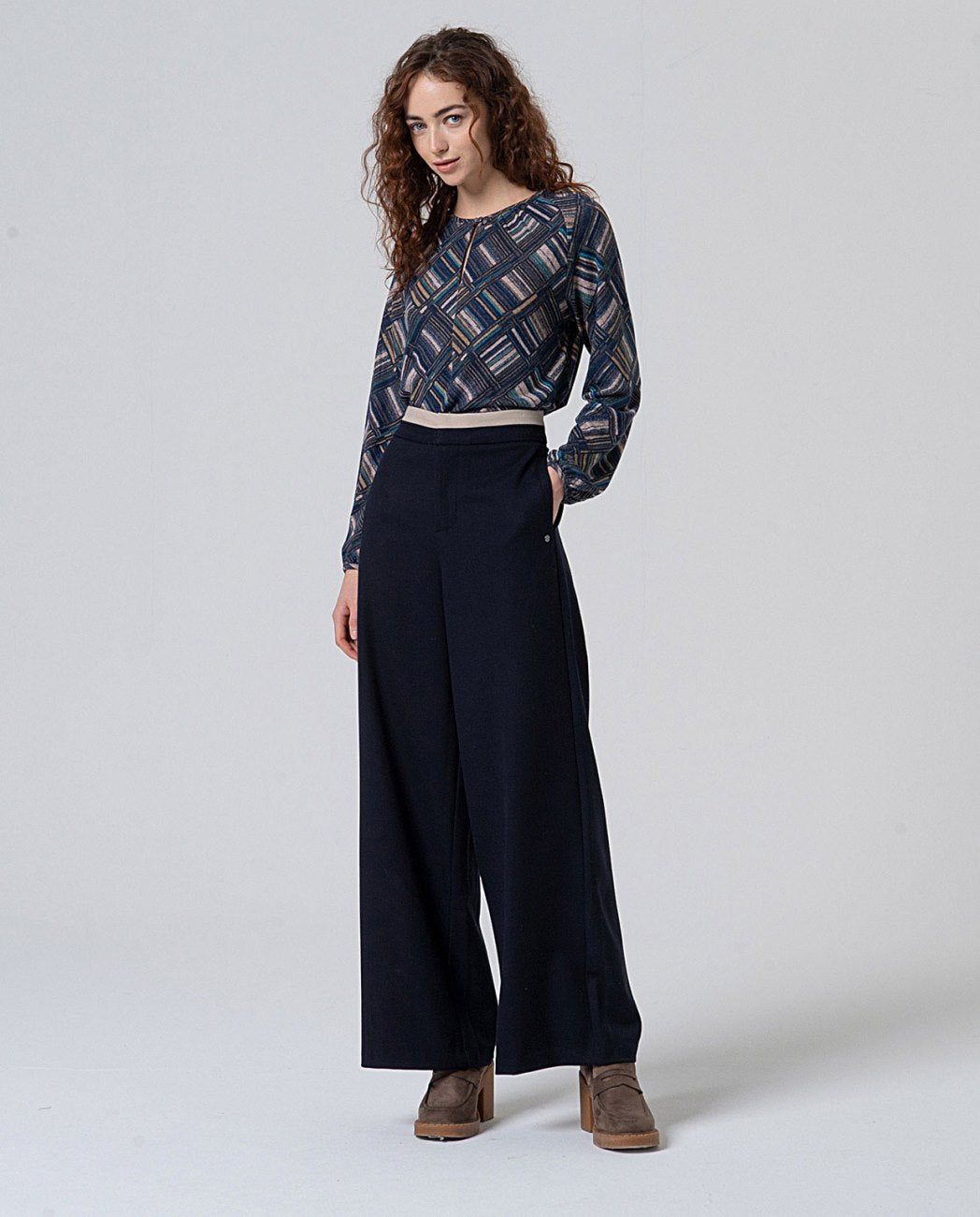 De Lily is een prachtige, zwarte broek met een contrasterende tailleband. De stof oogt heel rijkelijk en voelt ook zacht aan. De broek sluit met met een rits en een verborgen knoop. 2 steekzakken vooraan en geen achterzakken. Eentje waar je lekker stijlvol de deur mee uitkan.