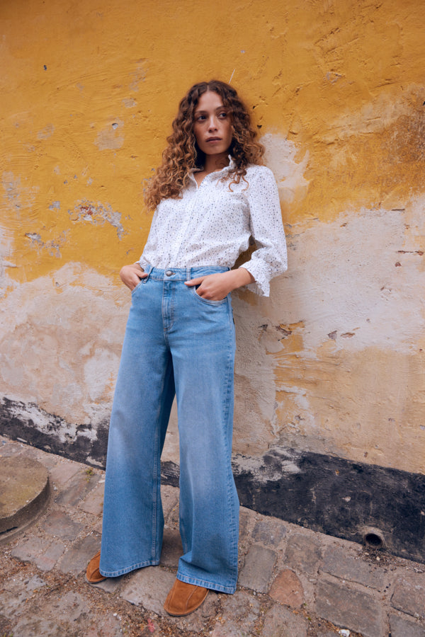 Trendy top jeans met prachtige wassing, hoge taille, wijde pijpen tot op de voet.