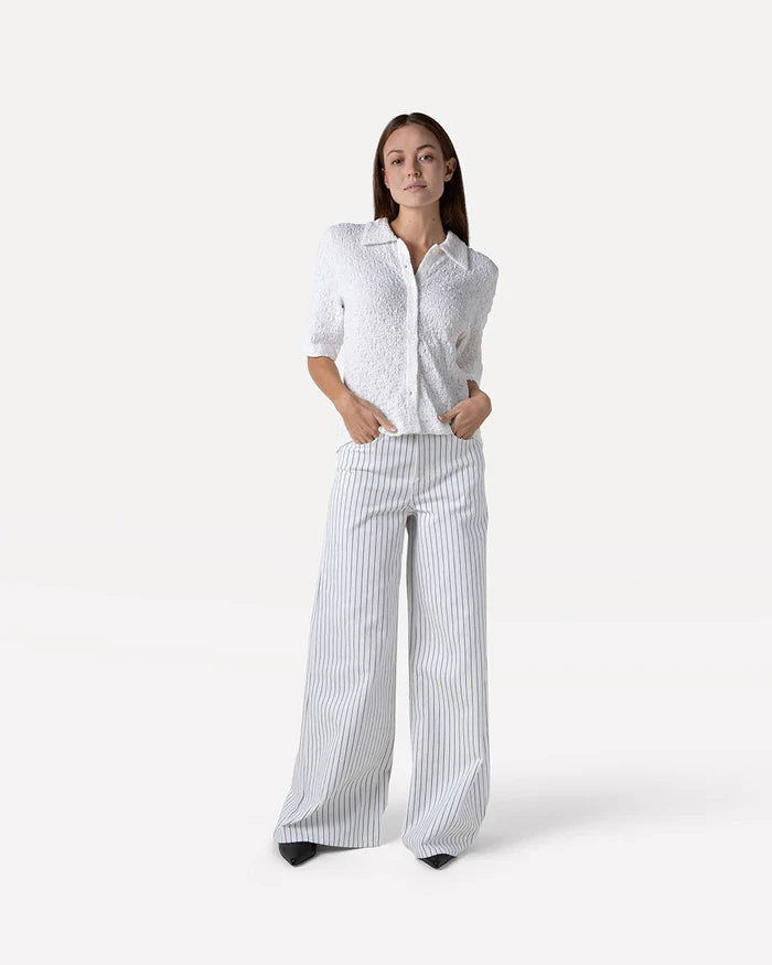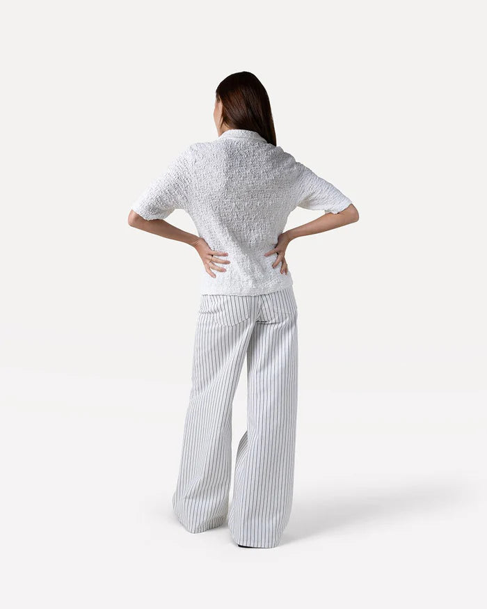De Moore Denim Wide Pants heeft een hoge taille en een flatterend silhouet met wijde pijpen, wat zorgt voor een tijdloze, relaxte pasvorm. De geweven strepen zorgen voor een subtiele textuur en unieke details, terwijl de medium twillstof zorgt voor structuur en duurzaamheid. Deze broek is gemaakt van gecertificeerd (BCI) katoen en combineert stijl met duurzaamheid. Perfect om te combineren met hakken of casual te houden met sneakers. Een veelzijdige en milieubewuste garderobe-essential die geschikt is voor elke gelegenheid.