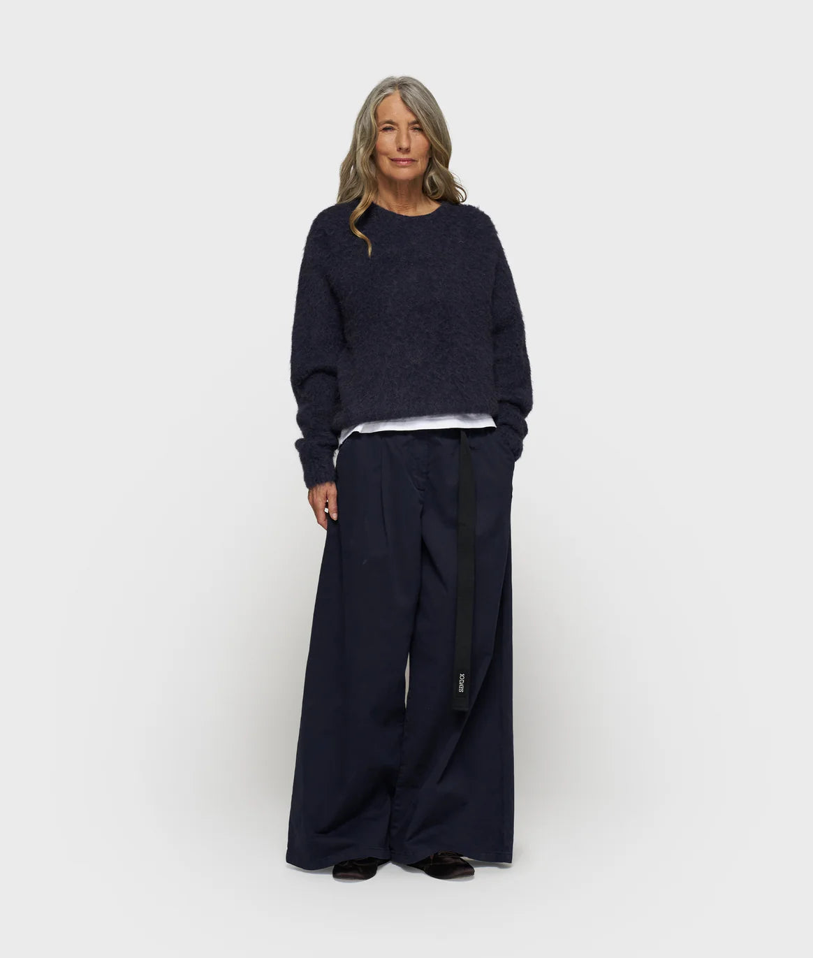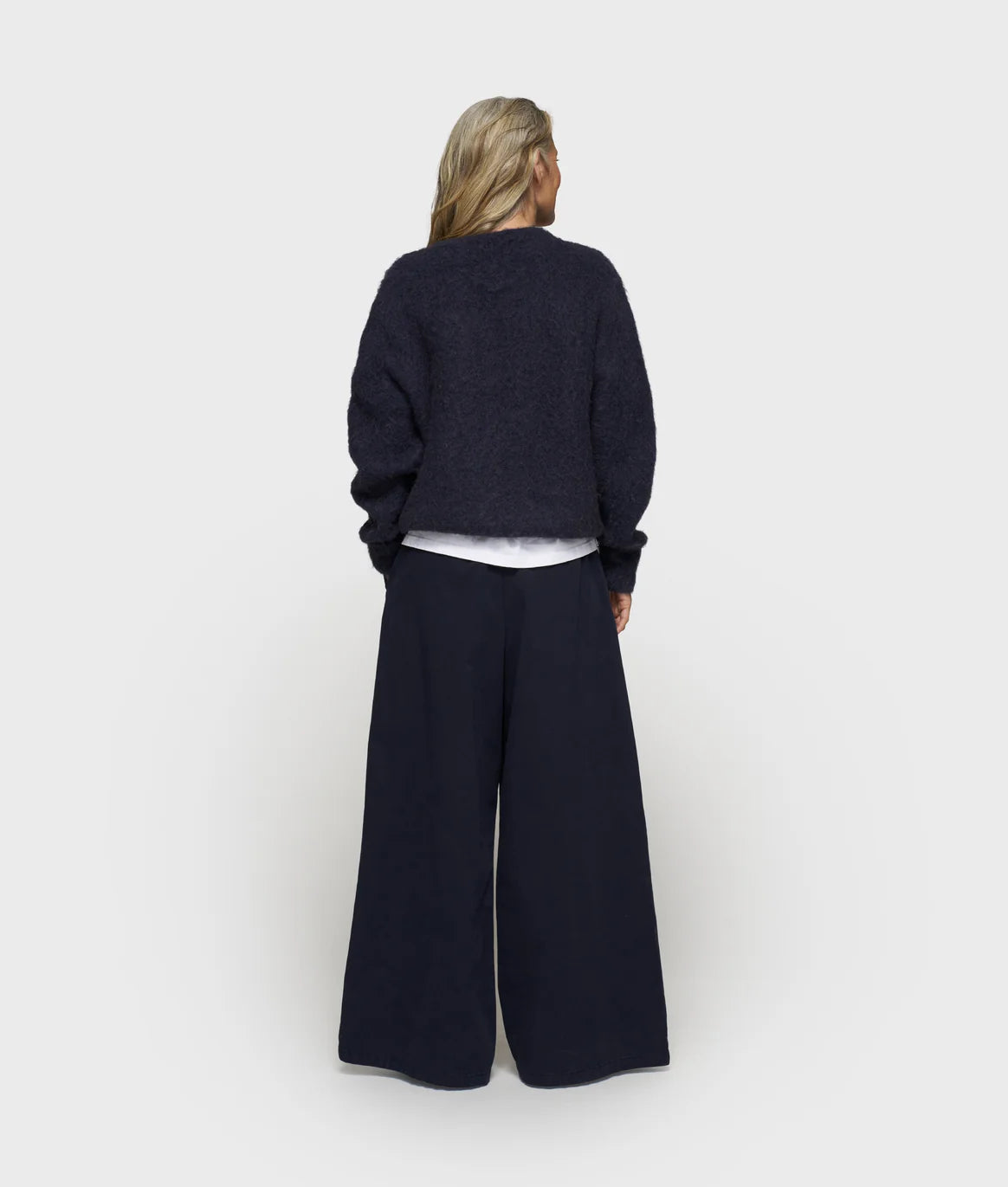 Donkerblauwe, oversized fit twill broek met wijde pijpen, gemaakt van GOTS gecertificeerd biologisch katoen. Voorzien van schuine steekzakken, '10'-monogramlogo onder de linkervoorzak en '10DAYS'-logolabel op de achterkant.