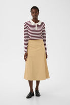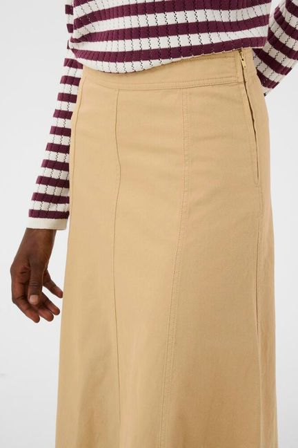 De Petrina rok van Part Two is het type kledingstuk dat meteen rust en verfijning brengt in je outfit. De kleur travertine — een zachte, neutrale tint — geeft de rok een tijdloze, minimalistische look die je moeiteloos kunt combineren met vrijwel elke top of knit.