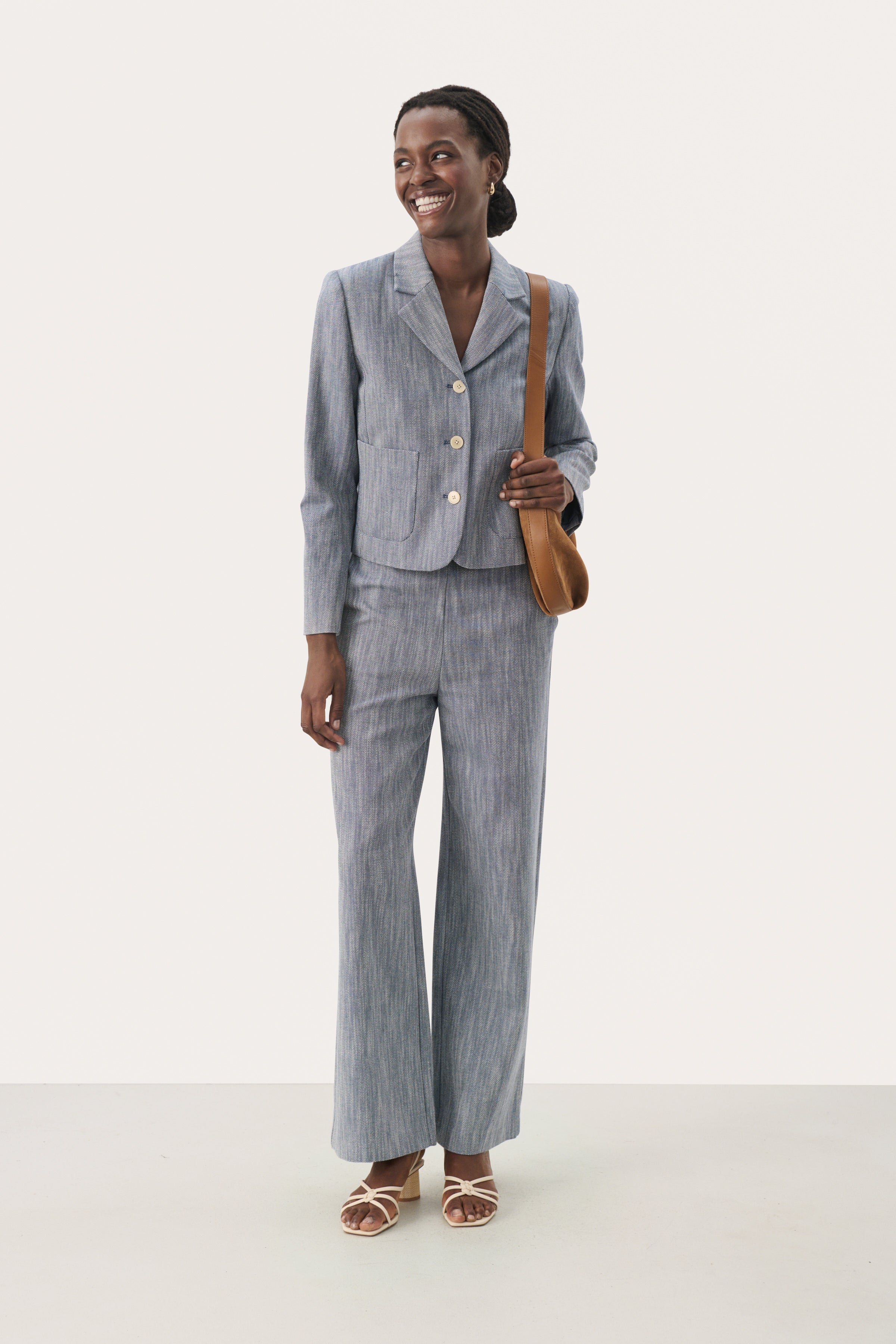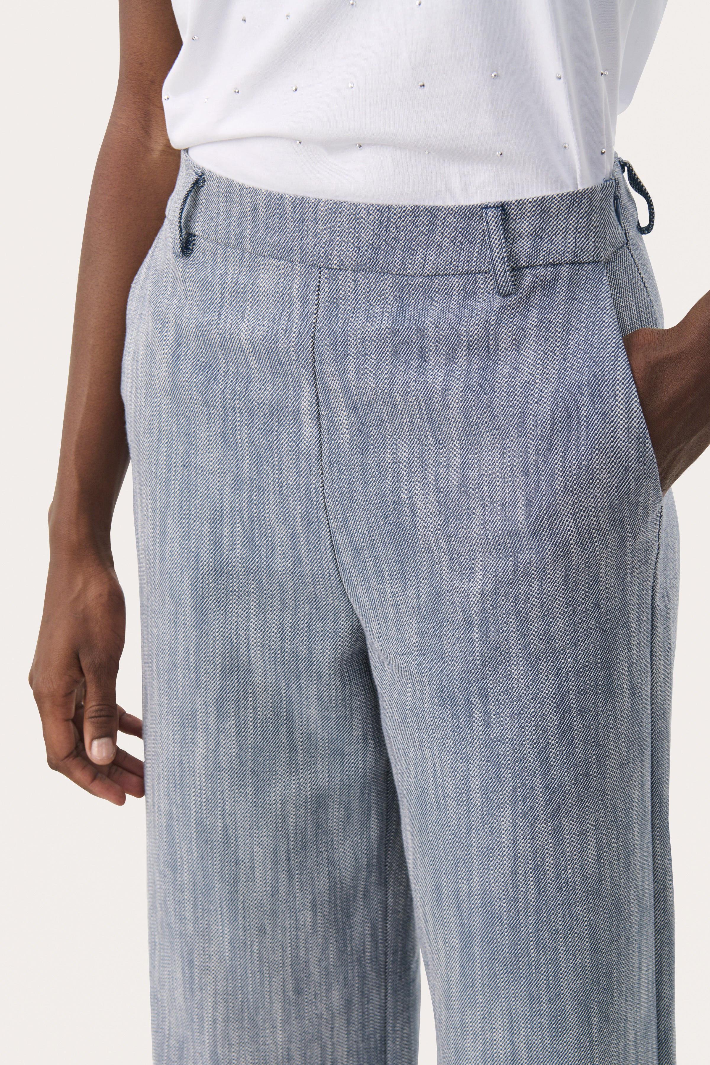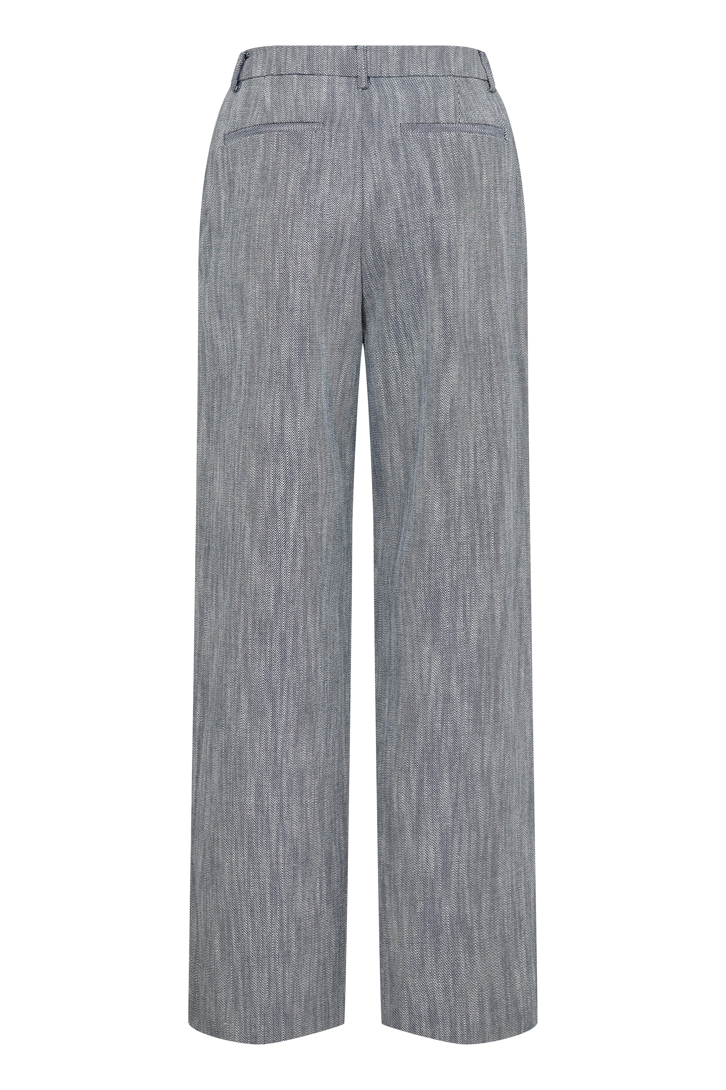 Een mooie, elegante broek in een blauwe melange. De Caidanes broek heeft brede, rechte pijpen en sluit met rits en knoop. Je kan combineren met bijhorende waistcoat of blazer.