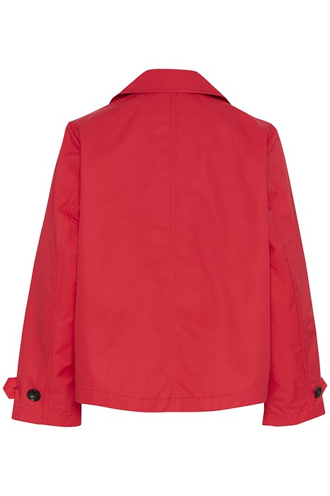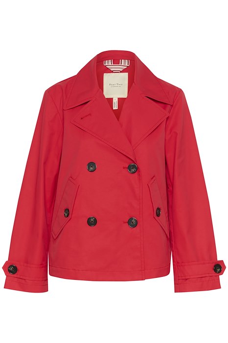 De Nelli is een stijlvolle, rode, korte trench met dubbele knopenrij en steekzakken die je kan sluiten met grote knopen.