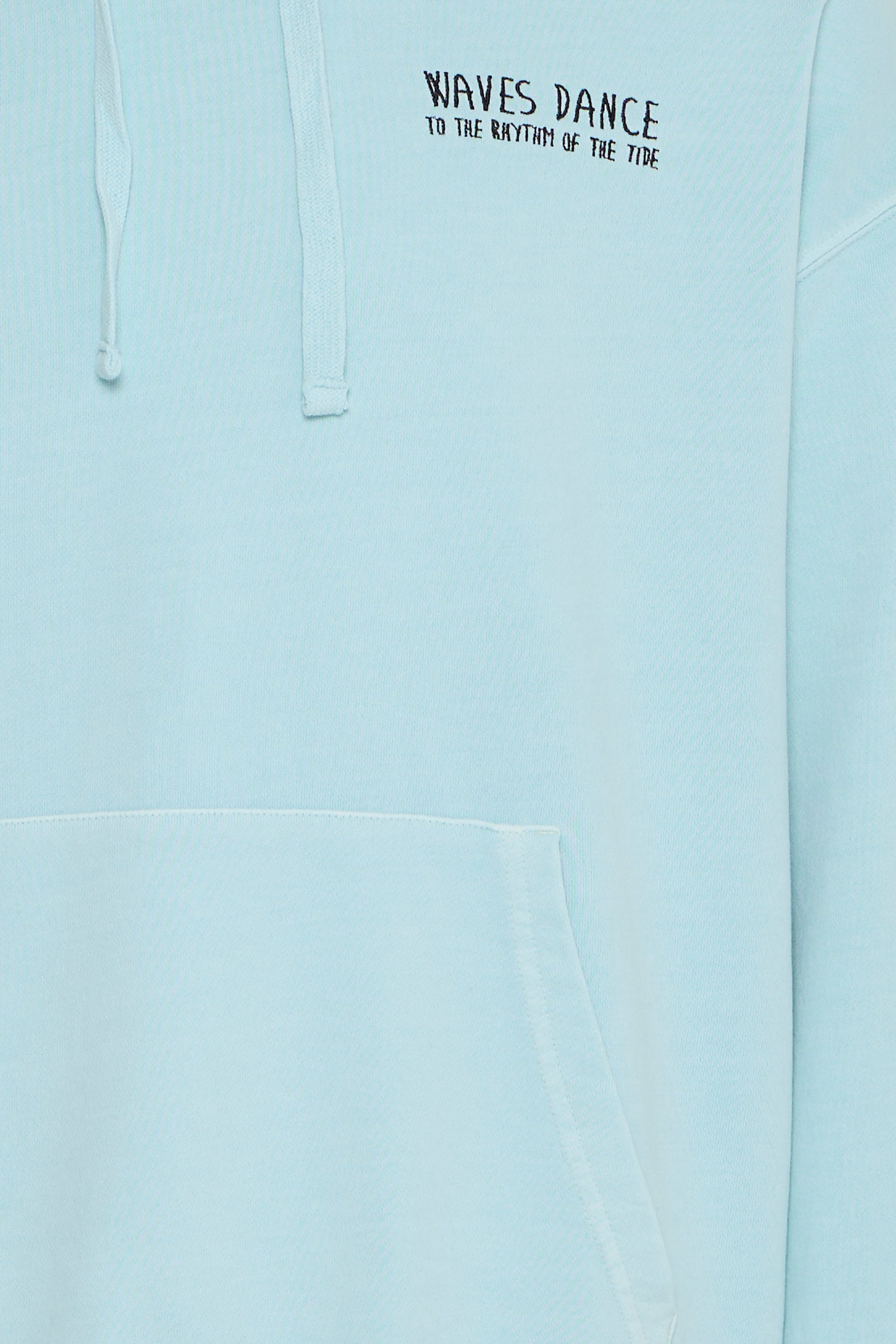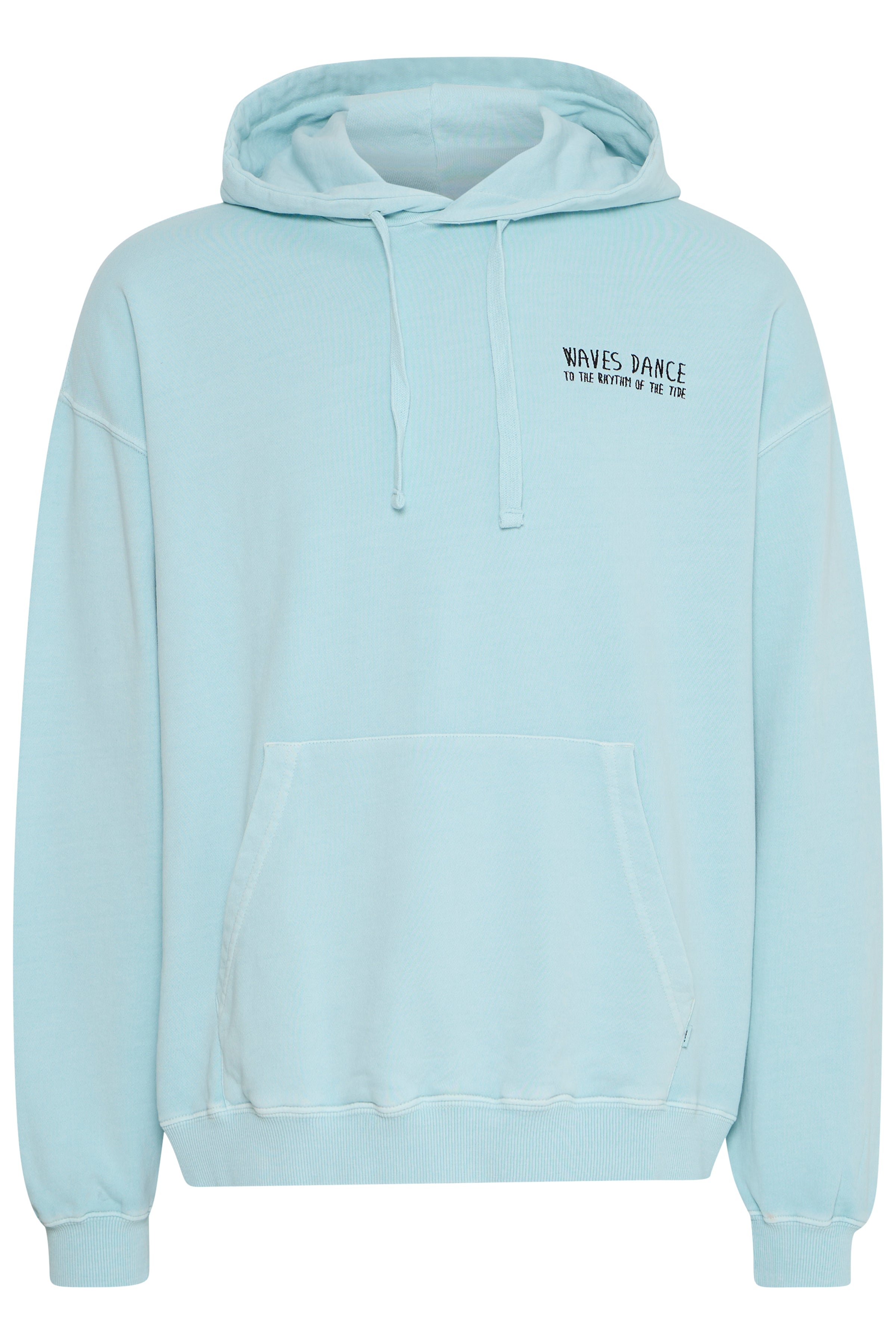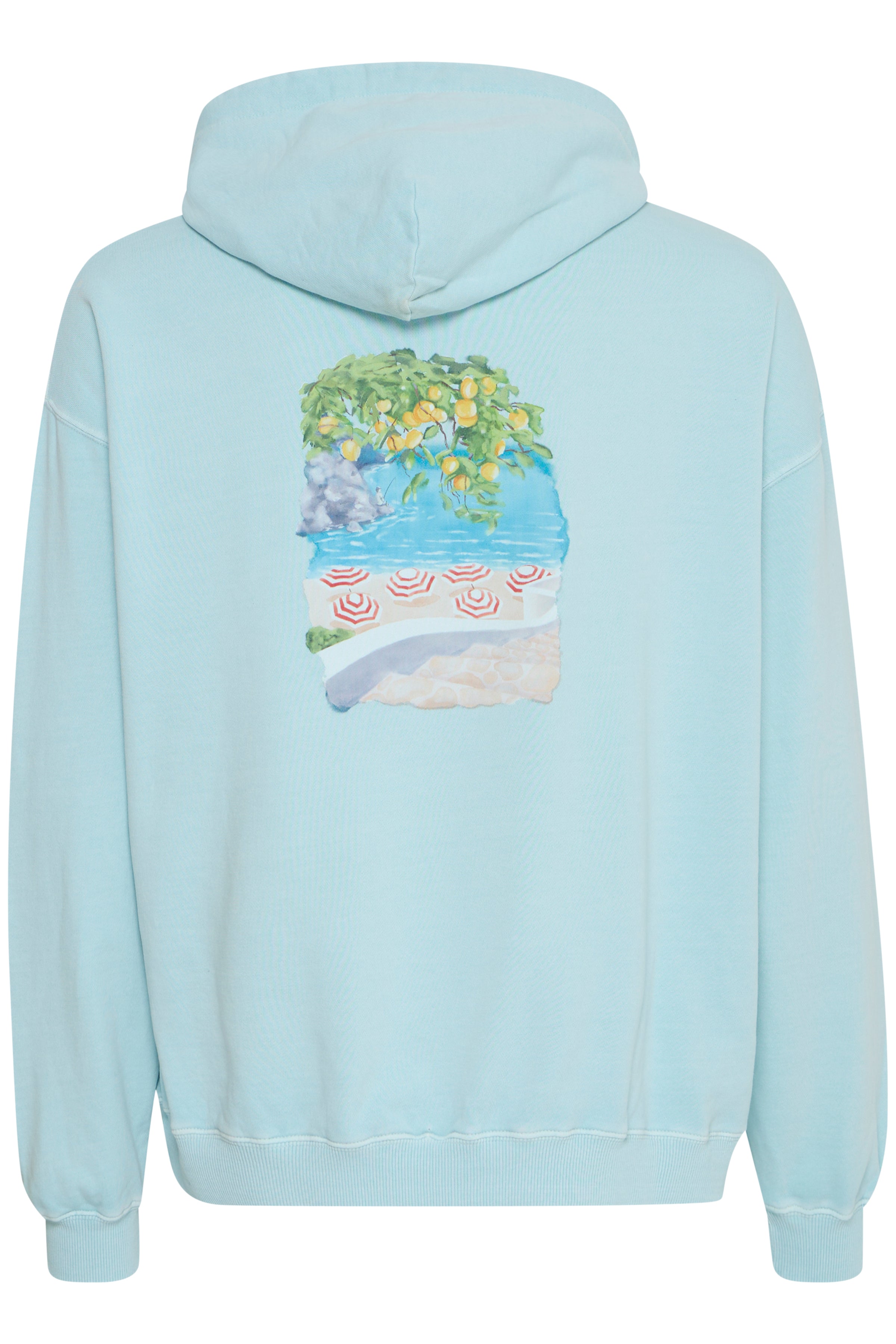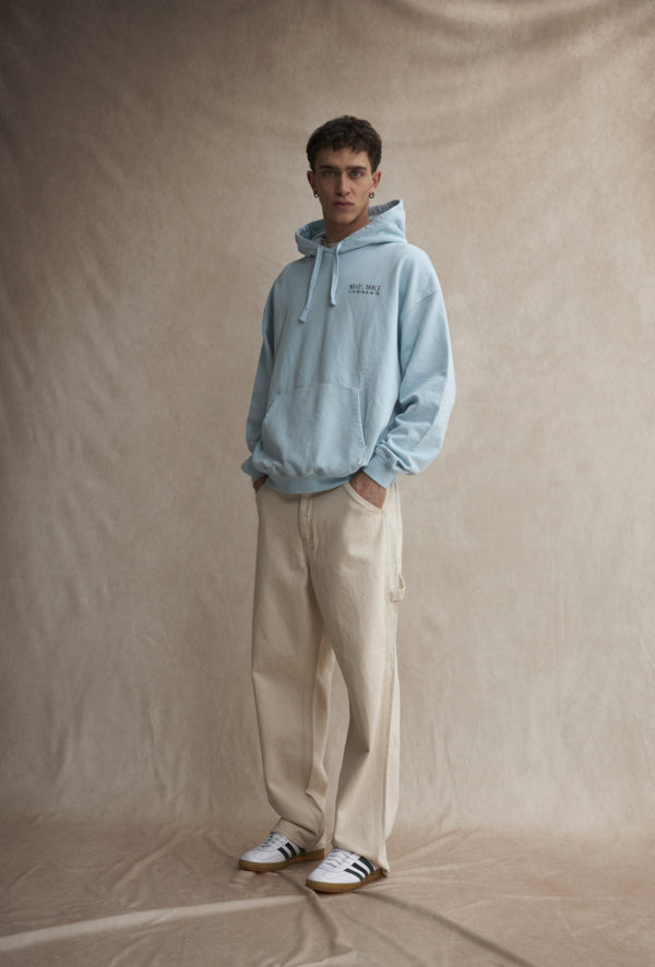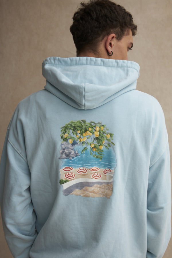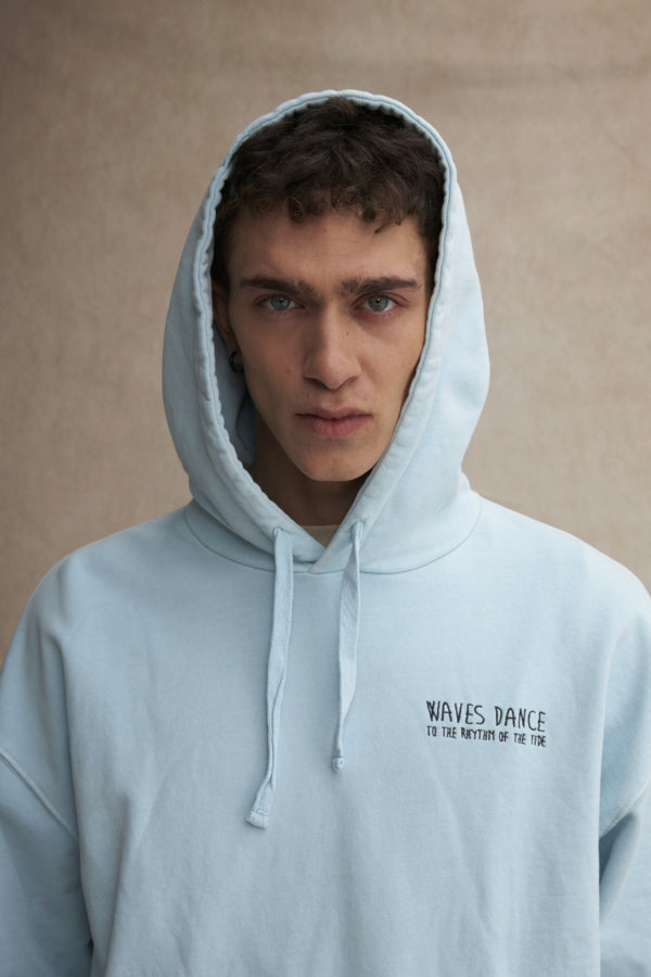 Zachtblauwe hoodie met kleine borstprint en grotere rugprint.