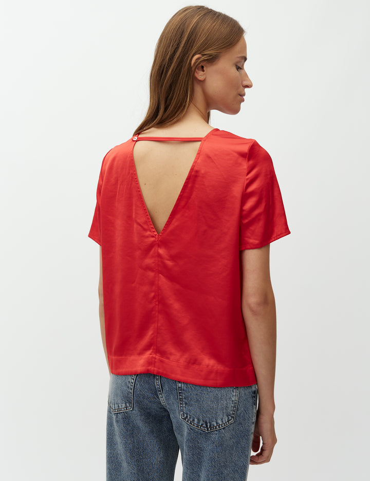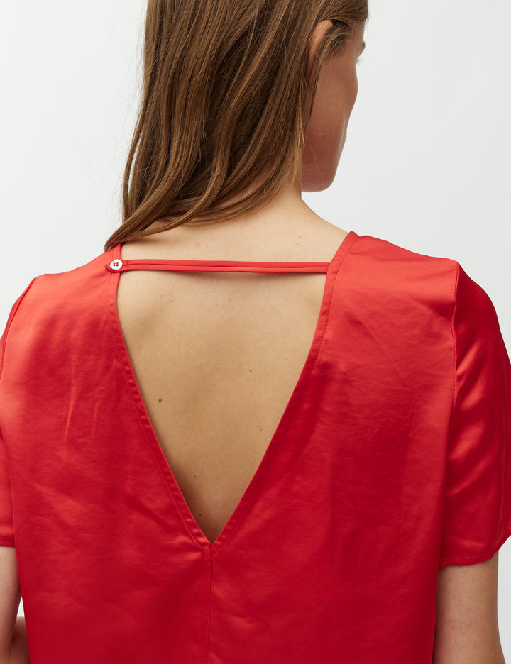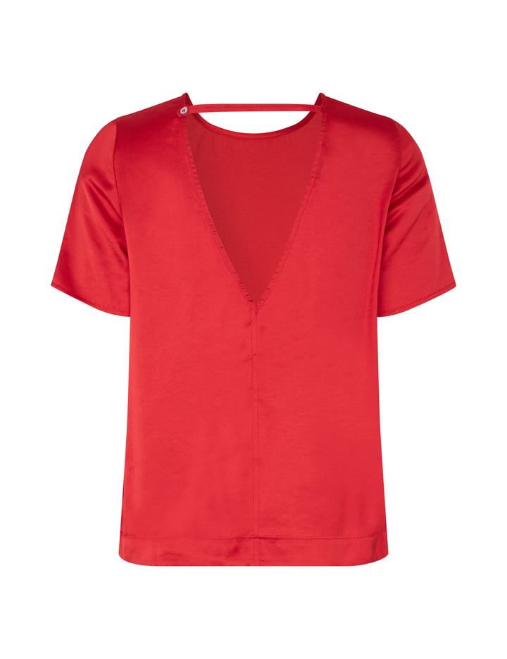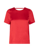 Deze rode Nivara top is een feestelijke, satijnen blouse met korte mouwen en een elegant rugdetail. Hij heeft een normale pasvorm en een ronde hals. Combineer hem samen met de Asaka broek in dezelfde kleur en stof en je hebt een tijdloze outfit voor elk feest.