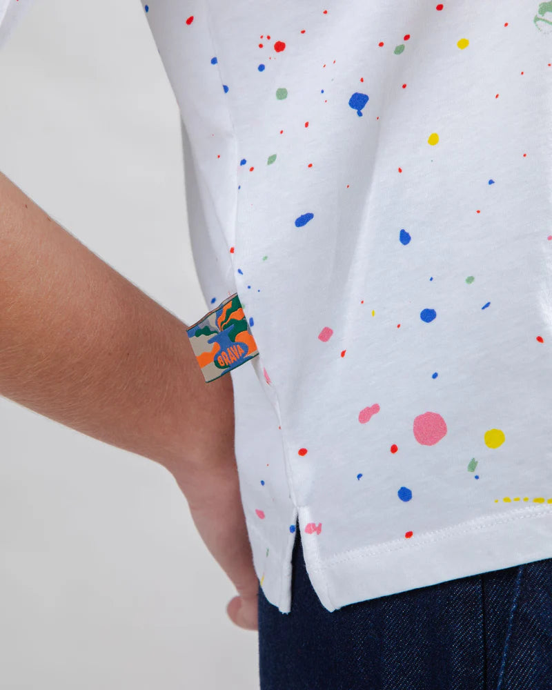 Minimalistisch in snit, maximaal in uitstraling. Dit witte T-shirt met rechte pasvorm krijgt een creatieve boost door de unieke verfspetter-print – artistiek, speels en toch subtiel.
