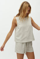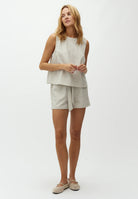 Ga je voor een stijlvolle set? Combineer de Tytus top moeiteloos met de bijpassende Juanita short of de Asaka broek voor een harmonieuze, trendy look. Liever mix & match? Dankzij de neutrale kleur past deze top ook perfect bij andere items in je garderobe – van denim tot elegante broeken of rokken.