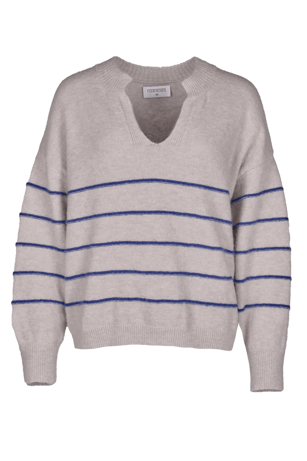 We love streepjes! Deze gebreide sweater met V-hals speelt het slim met een fijn streepdessin dat elegant doorloopt over de mouwen. Gemaakt in Belgische brei, dus zacht, eerlijk en van topkwaliteit. Heb je het snel koud? Combineer dan met de bijpassende sjaal.