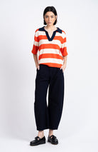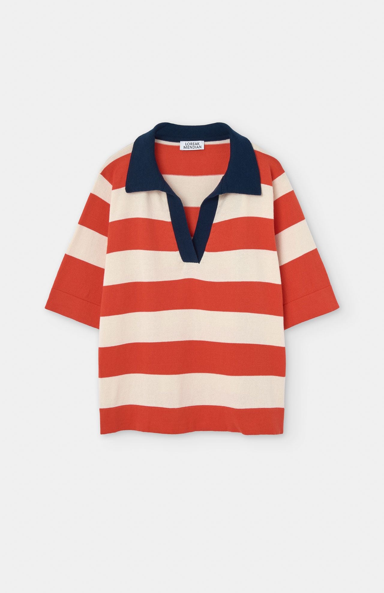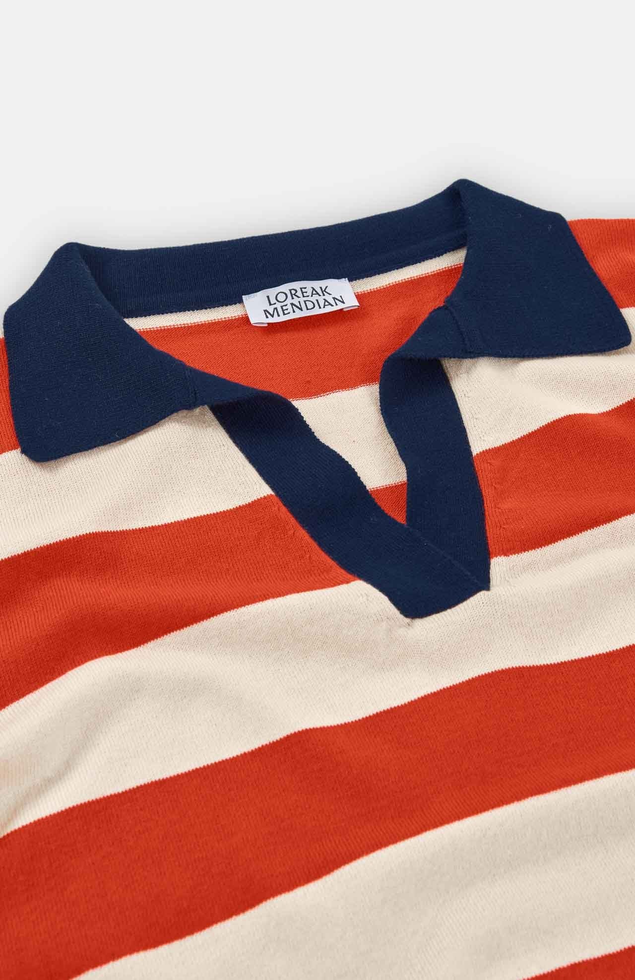 Gestreept polotruitje, gemaakt van biologisch katoen met korte mouwen en V-hals.