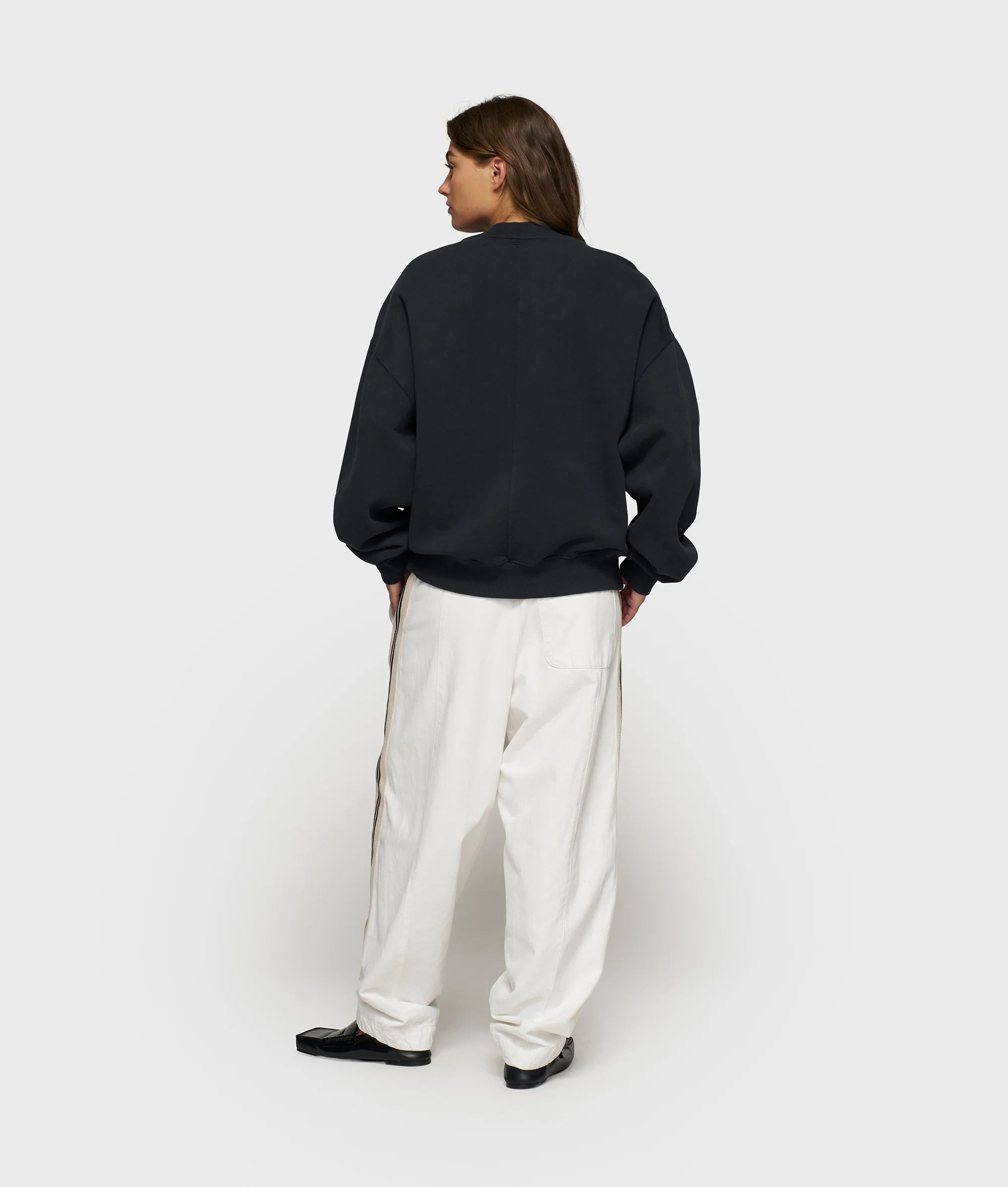 De college stijl is helemaal in dus deze baseball sweater kon niet ontbreken. Een oversized fit sweater, gemaakt van GOTS-gecertificeerd biologisch katoenen fleece. Voorzien van ribgebreide boorden, mini stripes logo geborduurd op de rug en een big '10' patch op de linkerborst.