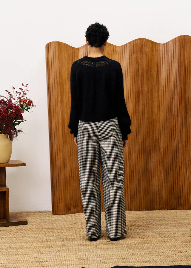 De Pivoine trui heeft een zwarte kleur, een kortere fit en een ronde hals met fijnere breisteek.