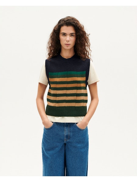 Aanpassende debardeur in een mix van donkerblauw, groen en zand. Lekker warm, tikkeltje retro!