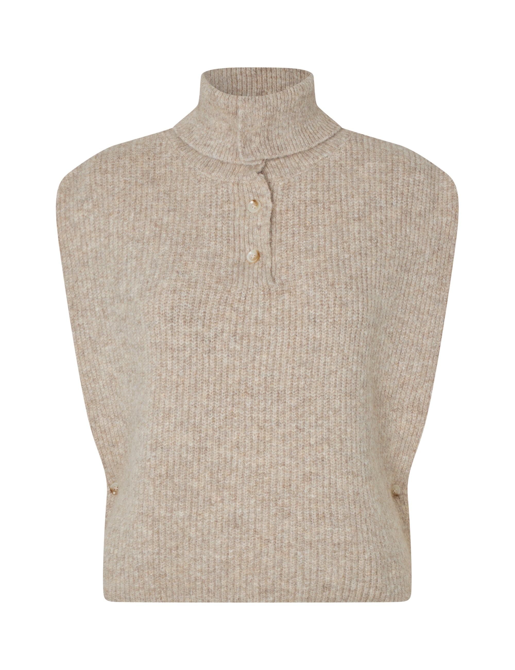 De Tristiana debardeur is er eentje met een opstaande kraag en 5 fijne knopen. Ideaal als extra laag over je blouse, longsleeve of t-shirt, of als laag onder je herstjas. De zijkanten zijn volledig open maar kan je onderaan dichtknopen met een knoop.