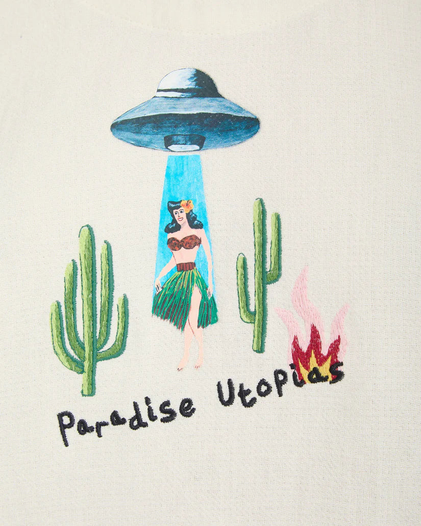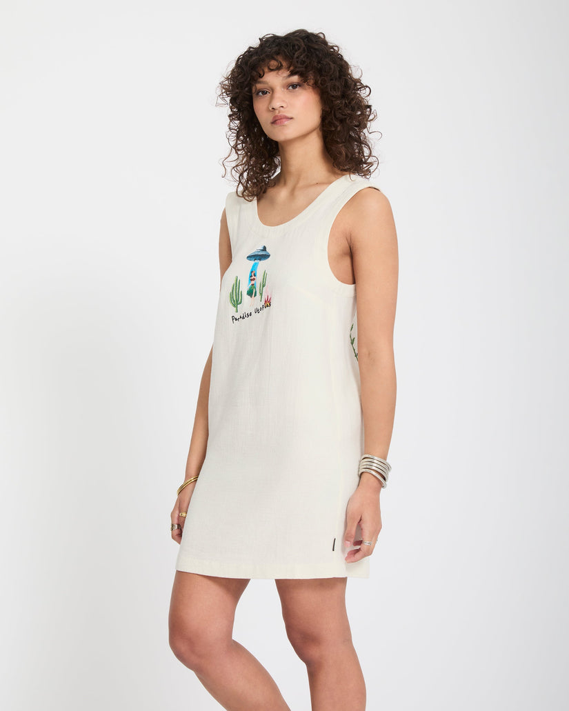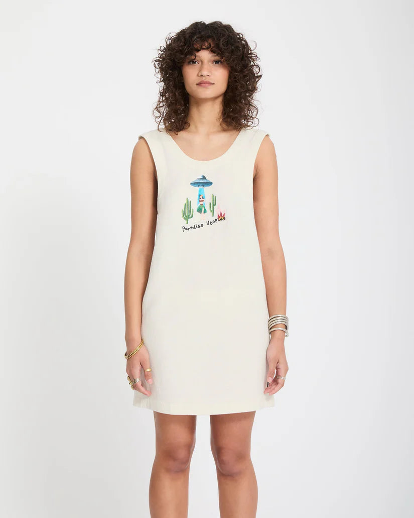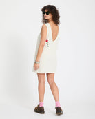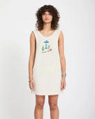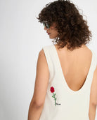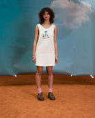 Dit mouwloos A-lijn model heeft vooraan een ronde kraag en acheraan een diepe ruguitsnijding. De geborduurde details op de voor- en achterkant zijn van de kunstenaar Mickey Mason.