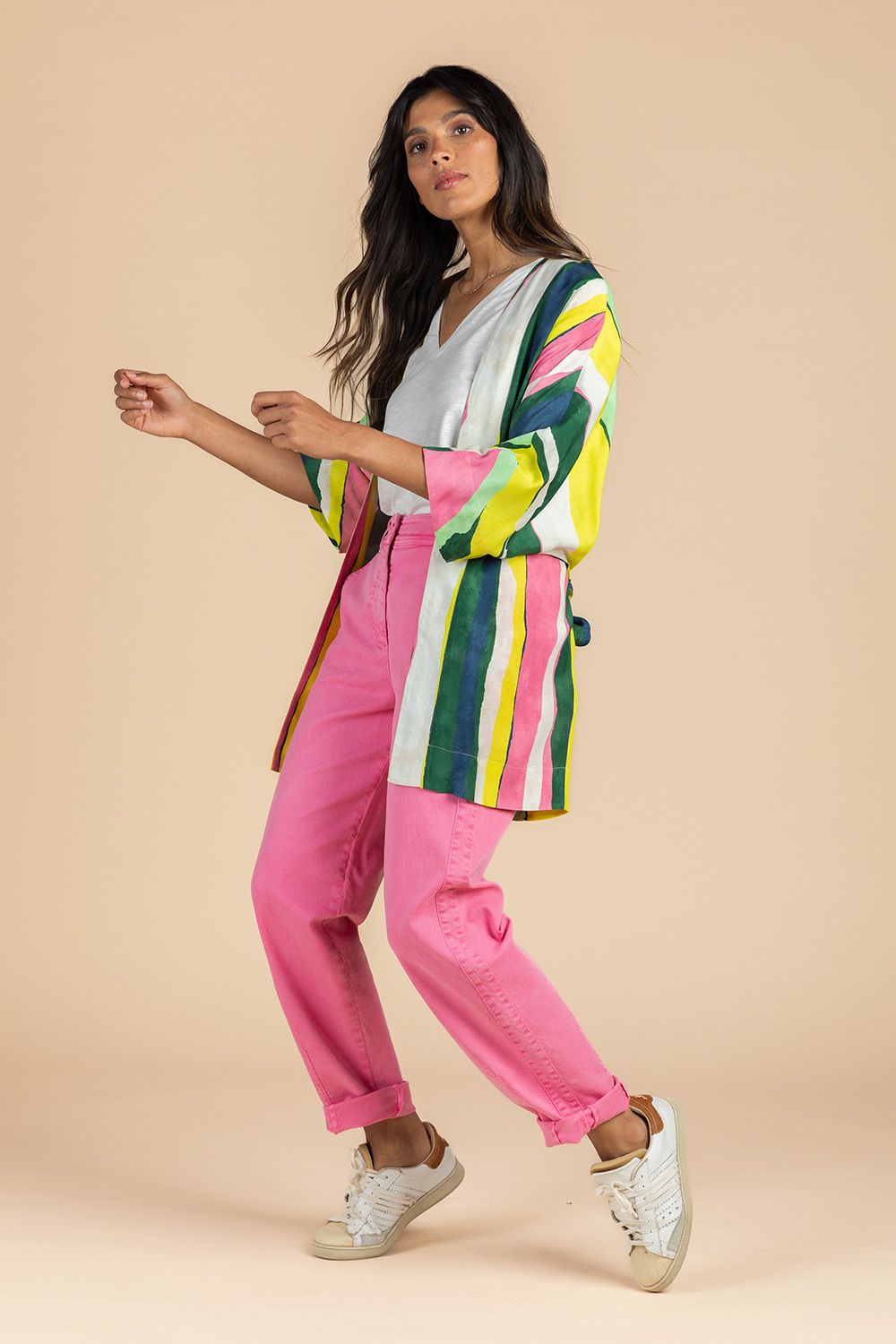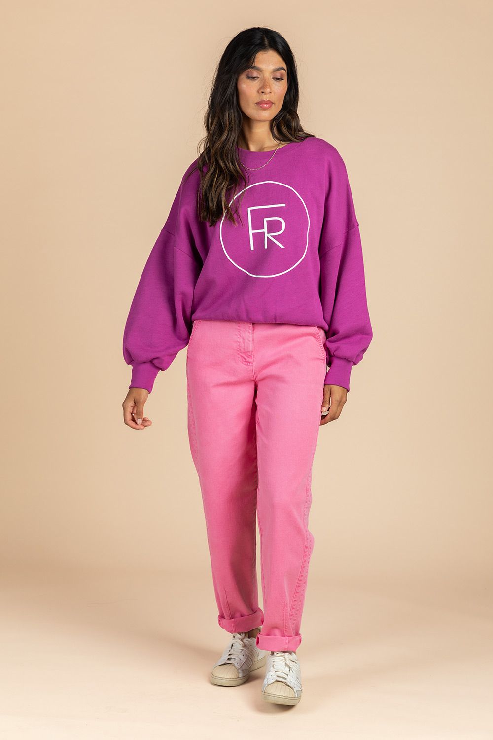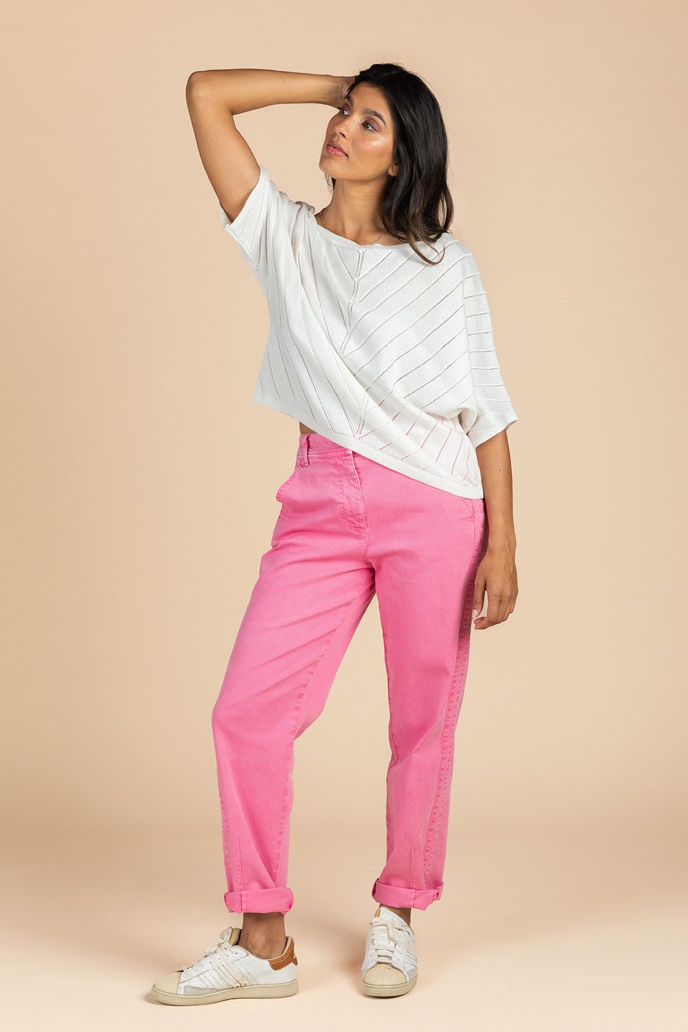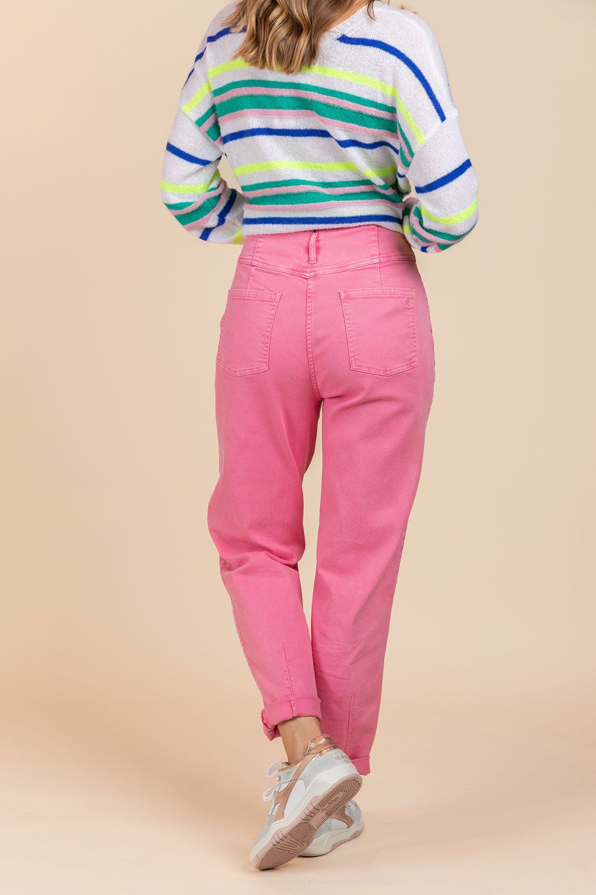 Deze roze jeansbroek heeft een lichte kokervorm door de figuurnaden aan de zoom. De statement band langs de zijnaad en de hogere achterkant zorgen voor zowel stijl als een perfecte pasvorm.
